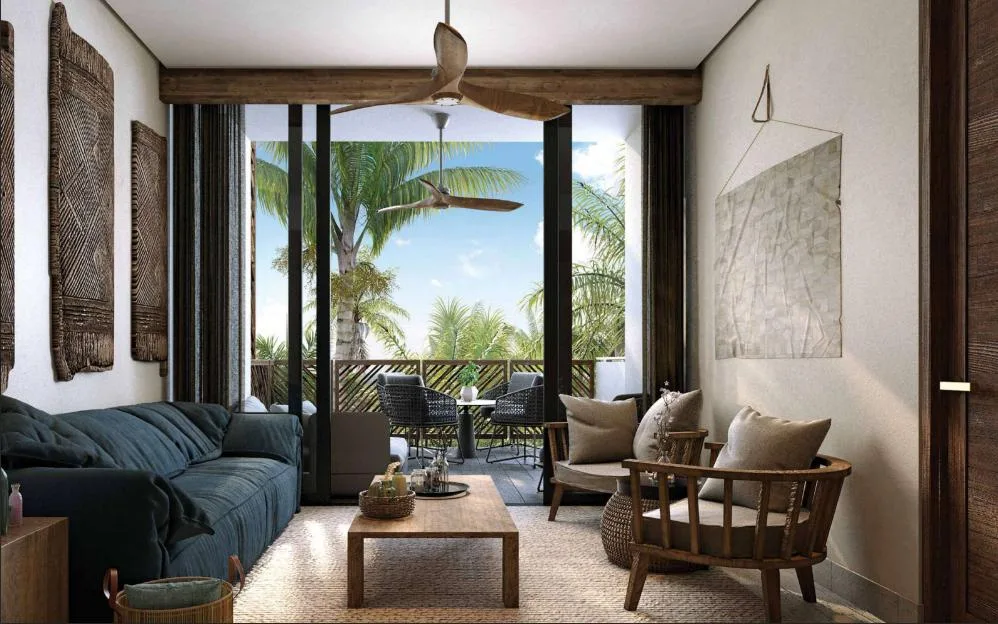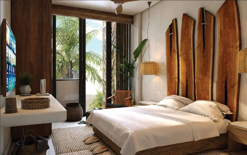 This 37 square meter living suite in Tulum is a functional and modern space, featuring one bedroom and one bathroom.