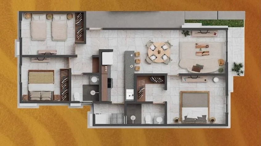 Thoughtfully designed residences maximize space and functionality, with options featuring 2 and 3 bedrooms. Two-bedroom residences include spacious bedrooms, an open-concept living and dining area, a fully equipped kitchen with a granite countertop, full bathrooms, a balcony or terrace, and a service area.