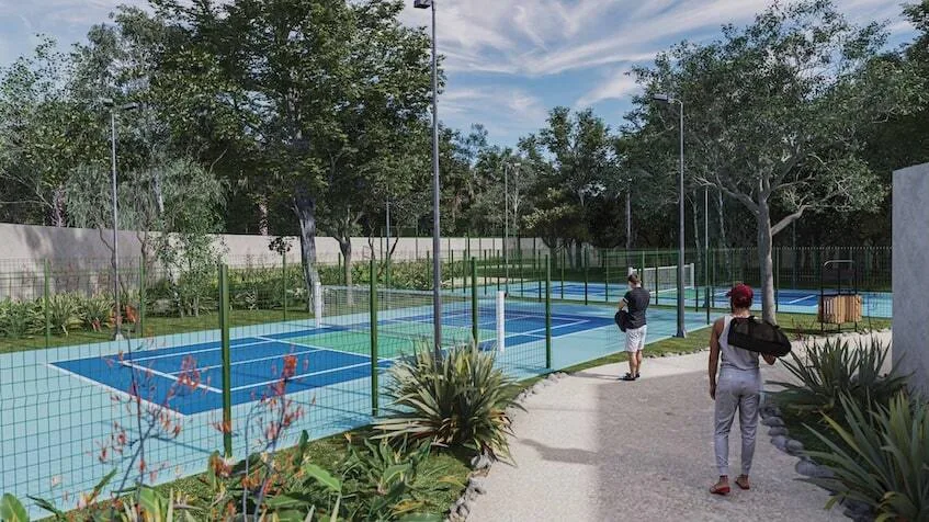 The property features extensive amenities integrated into expansive green areas with walking trails. These include a cenote-style swimming pool, a paddle court, a pickleball court, a family palapa, a zen zone, a pet park, and a grill area. The community offers controlled access and 24/7 security.