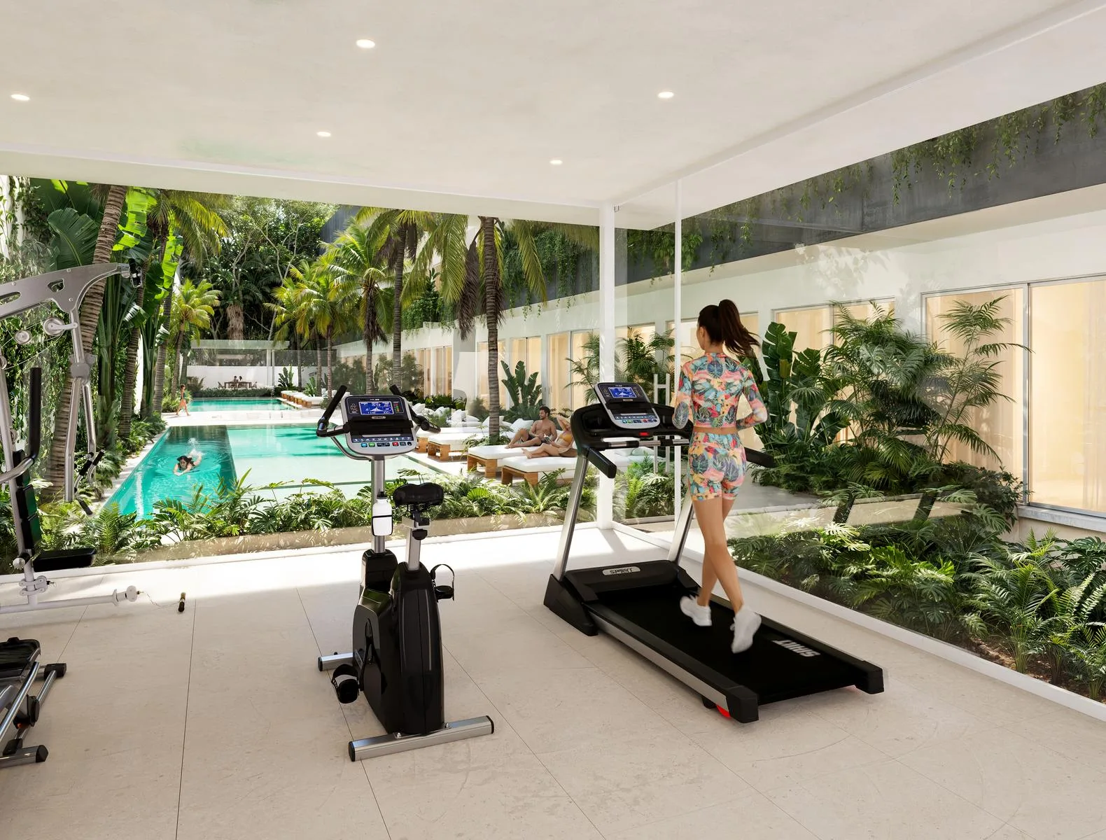 This modern apartment features a 2-bedroom lock-off design. It includes a private terrace and access to a swimming pool, reflecting a distinctive Tulum lifestyle.