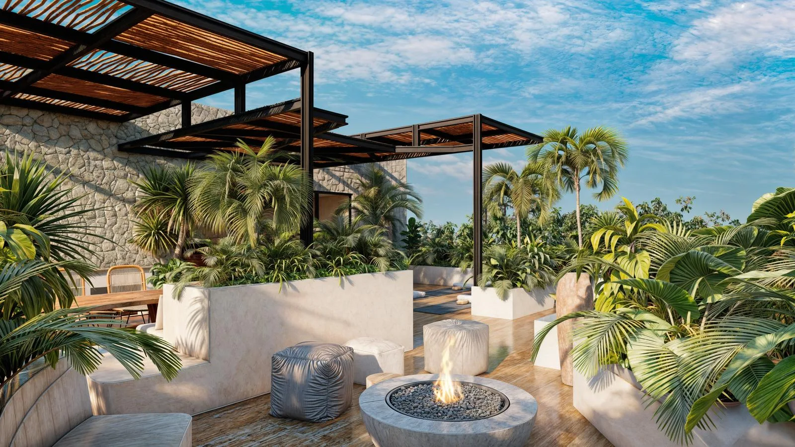 Residents have access to a swimming pool and a hammock area for relaxation. There is a coworking space and a lounge area for work and rest. A dedicated yoga area and a sauna are available for wellness. For social gatherings, there is a grilling area and a fire pit. The building also includes a gymnasium and a bar.