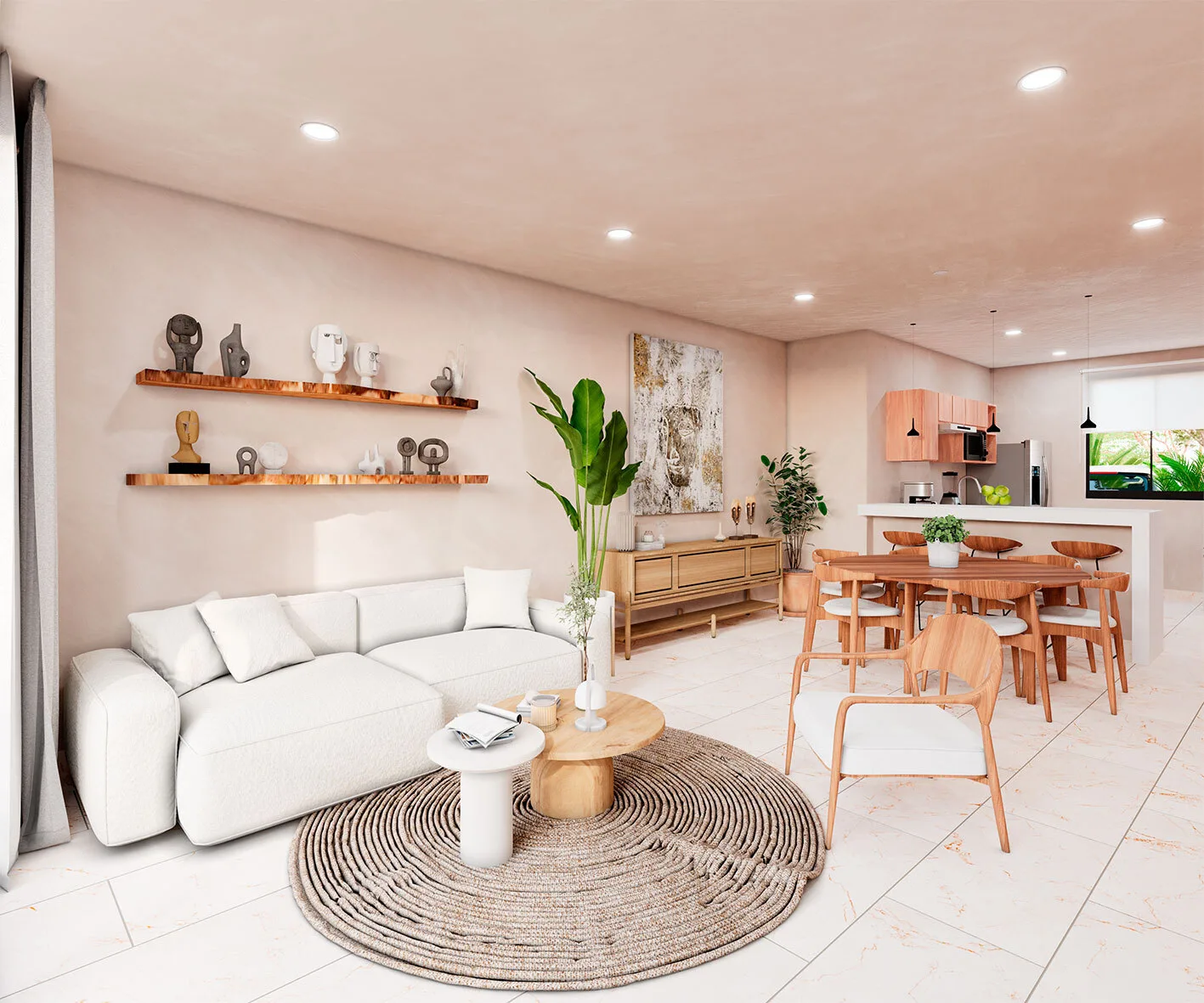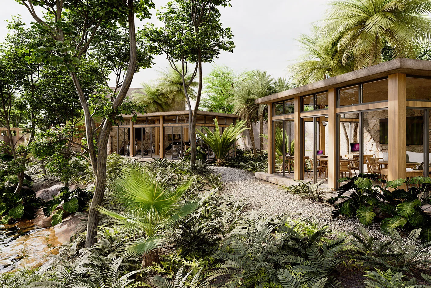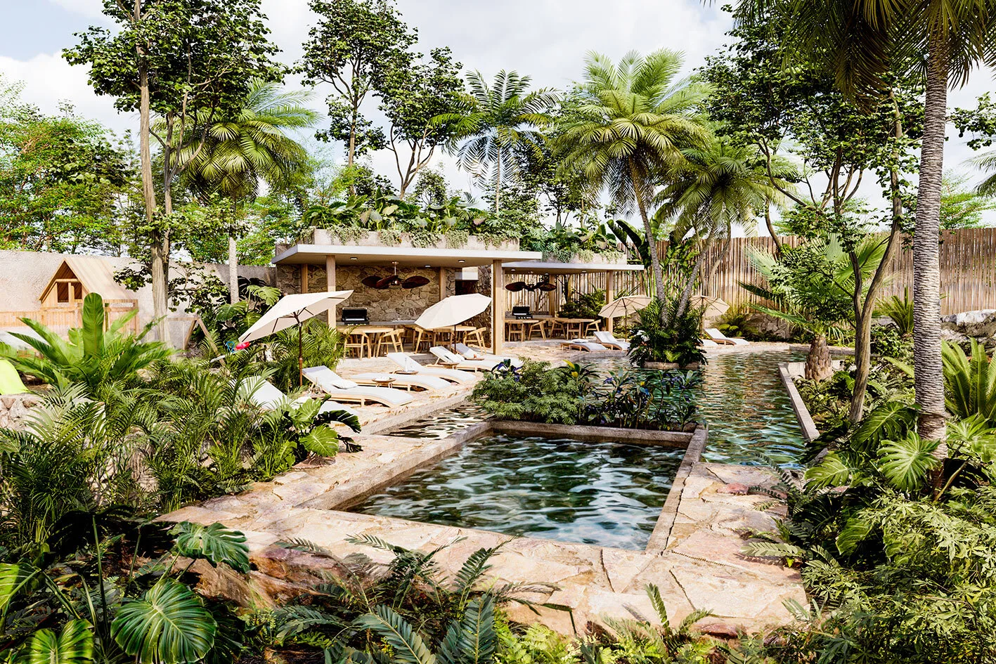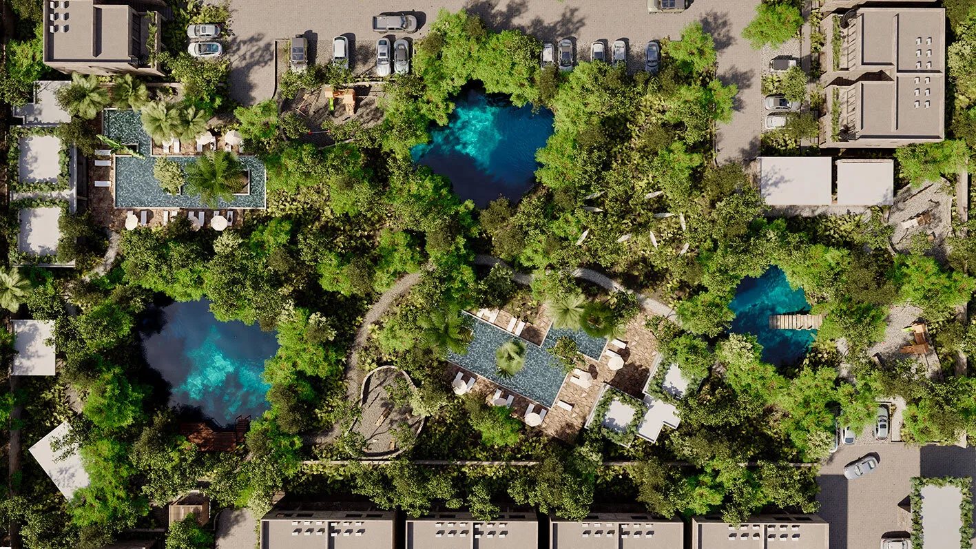 Discover a thoughtfully planned community in Tulum where cenotes and green spaces are central features. The design is inspired by ancestral traditions and integrates with the natural jungle environment, promoting calm walks and outdoor activities.