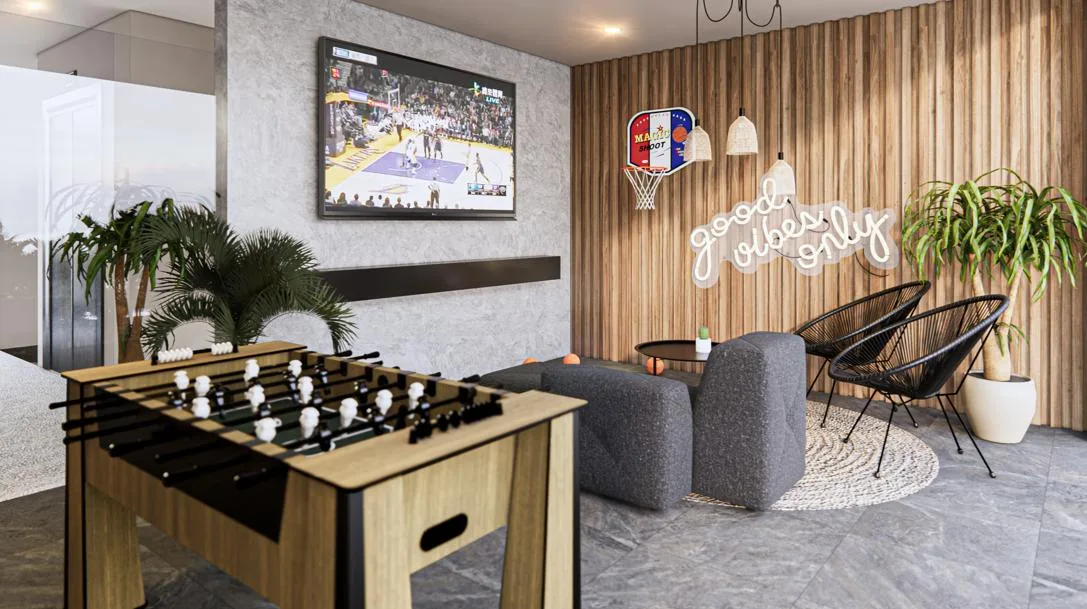 The residence offers access to a gym, a coworking area, a rooftop with a swimming pool, a spa, sunbeds, a game room, a fire pit, and a sky bar.