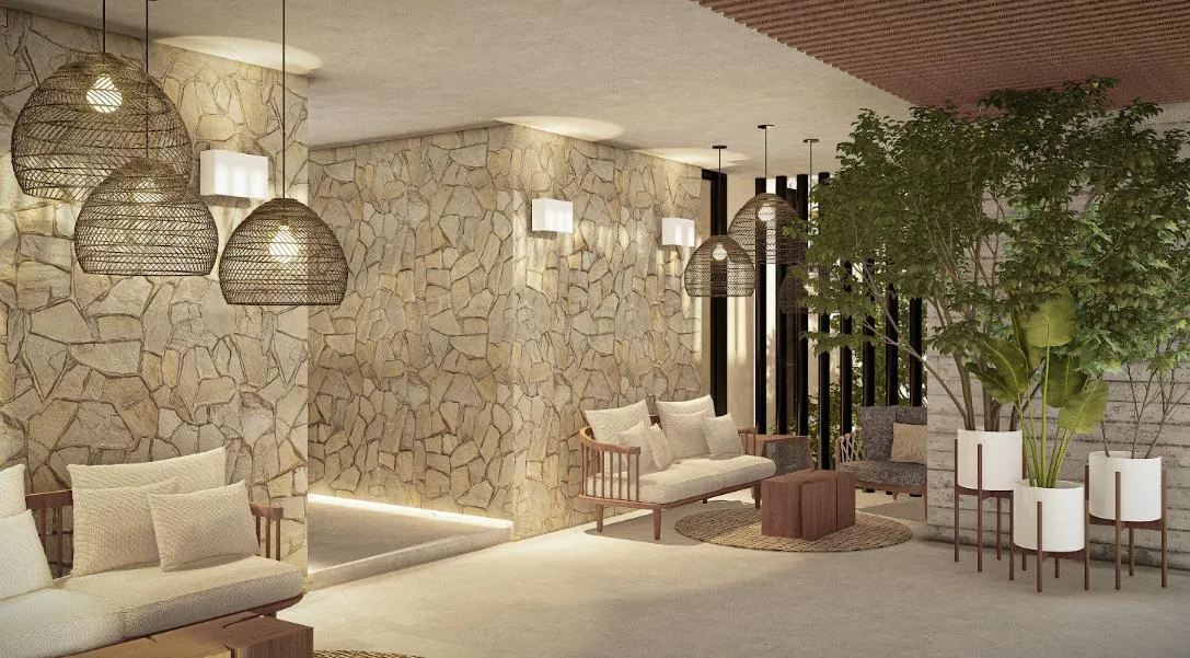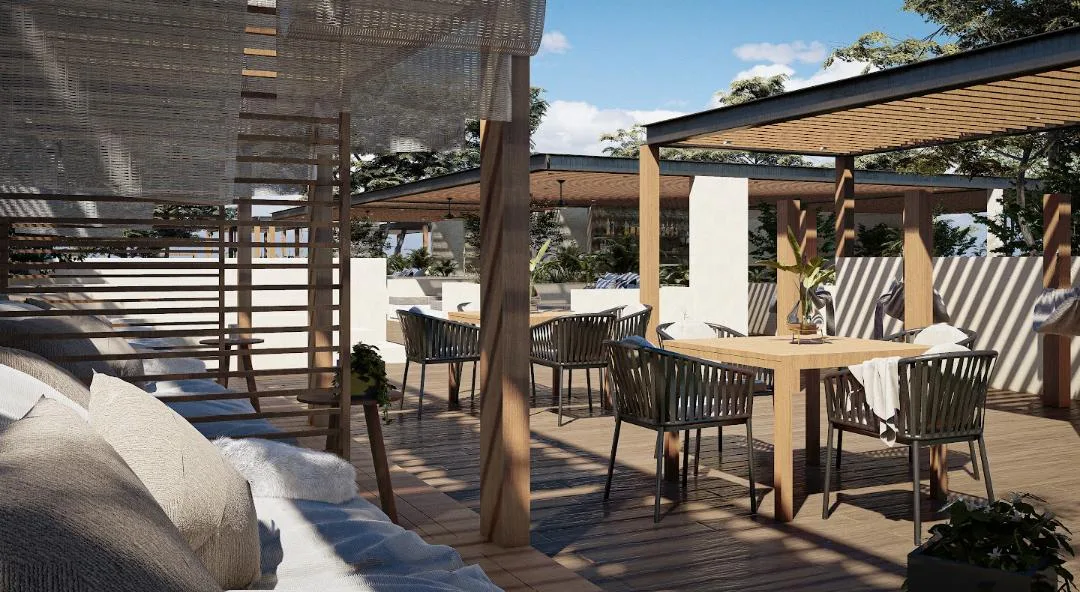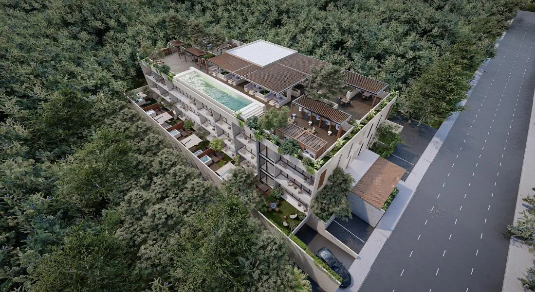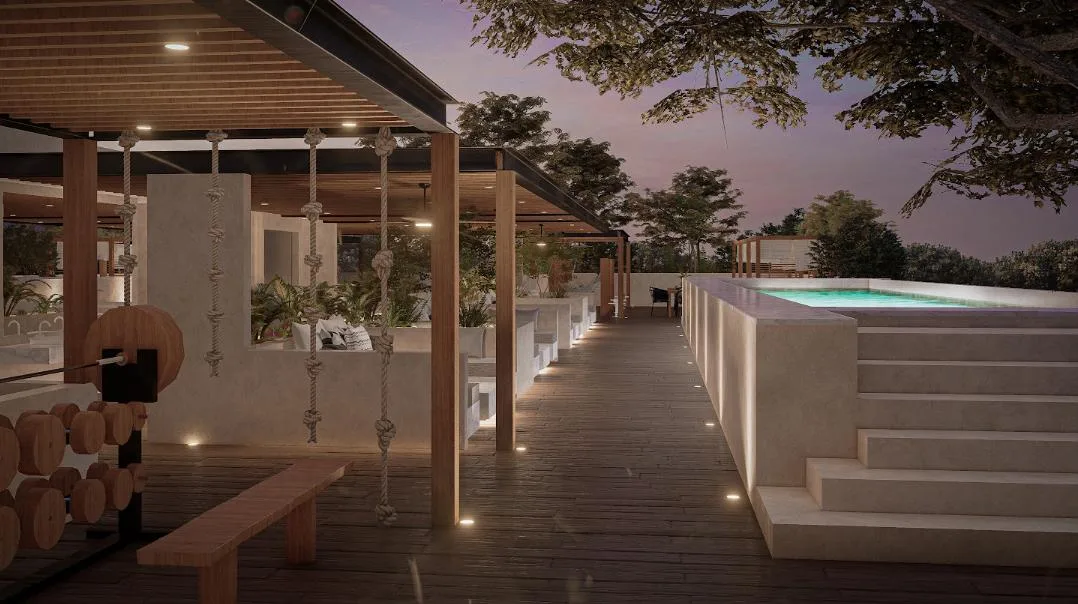 The project's design emphasizes wellness and community living. The development features a unique collection of amenities including a swimming pool, a jungle gym, hammocks, a dedicated yoga area, a solarium, a fire pit, and a combined grill and bar area. The property also includes underground parking.