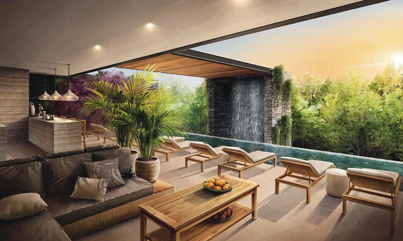 The residence features an infinity pool with spectacular views, a sun deck area for enjoying the outdoors, and a grill area ideal for social gatherings. Additional amenities include a sky bar for enjoying sunsets, a workout station and yoga area for wellness, and convenient rooftop bathrooms.