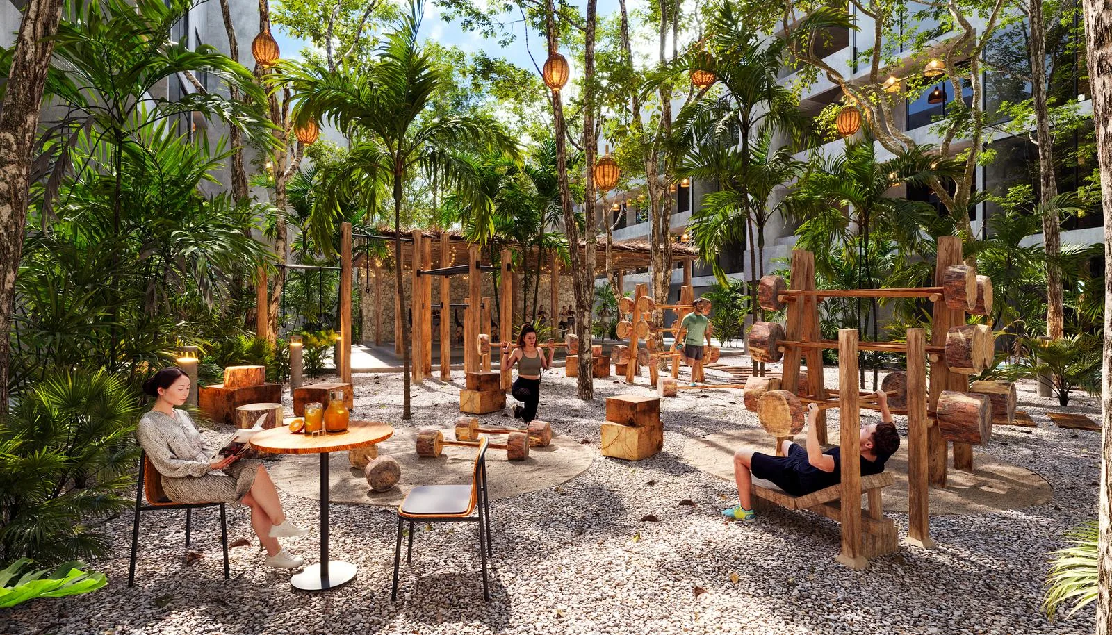 For fitness and wellness, there is a gym, a yoga studio, and a FireFit area. The building includes a children's play area and a massage room.