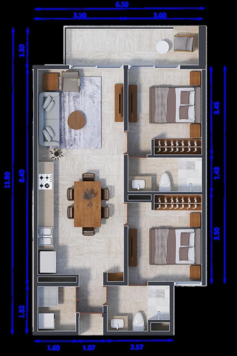 The two-bedroom premium model provides 91. 01 square meters total, featuring two bedrooms, a living and dining area, an integrated kitchen, two full bathrooms, a laundry area, and two terraces.