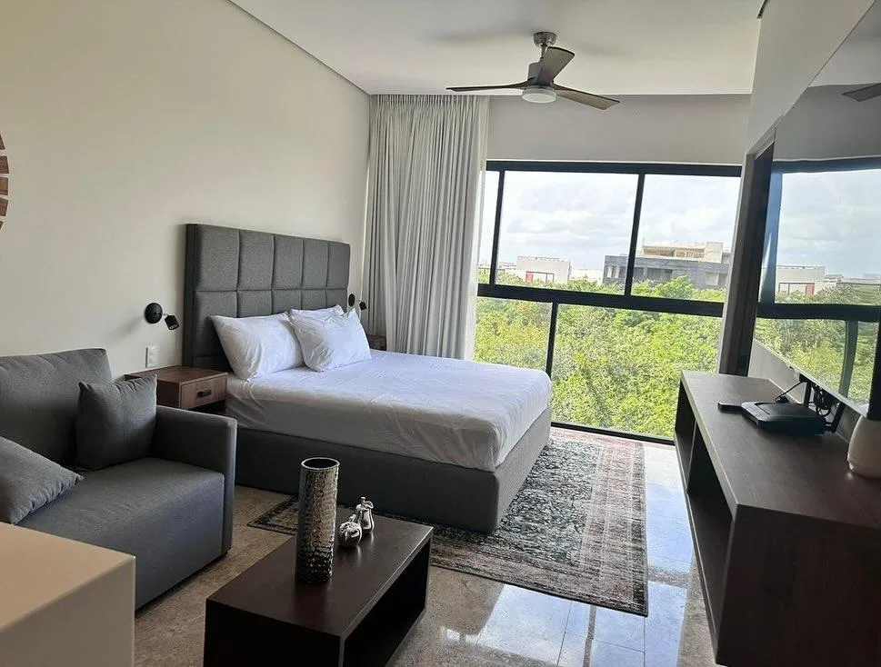 This 50-square-meter loft in Giaga Towers, Tulum, is fully furnished and equipped. It features a kitchenette, a king-size bed, and a living area with a television, all within a single open space without divisions.
