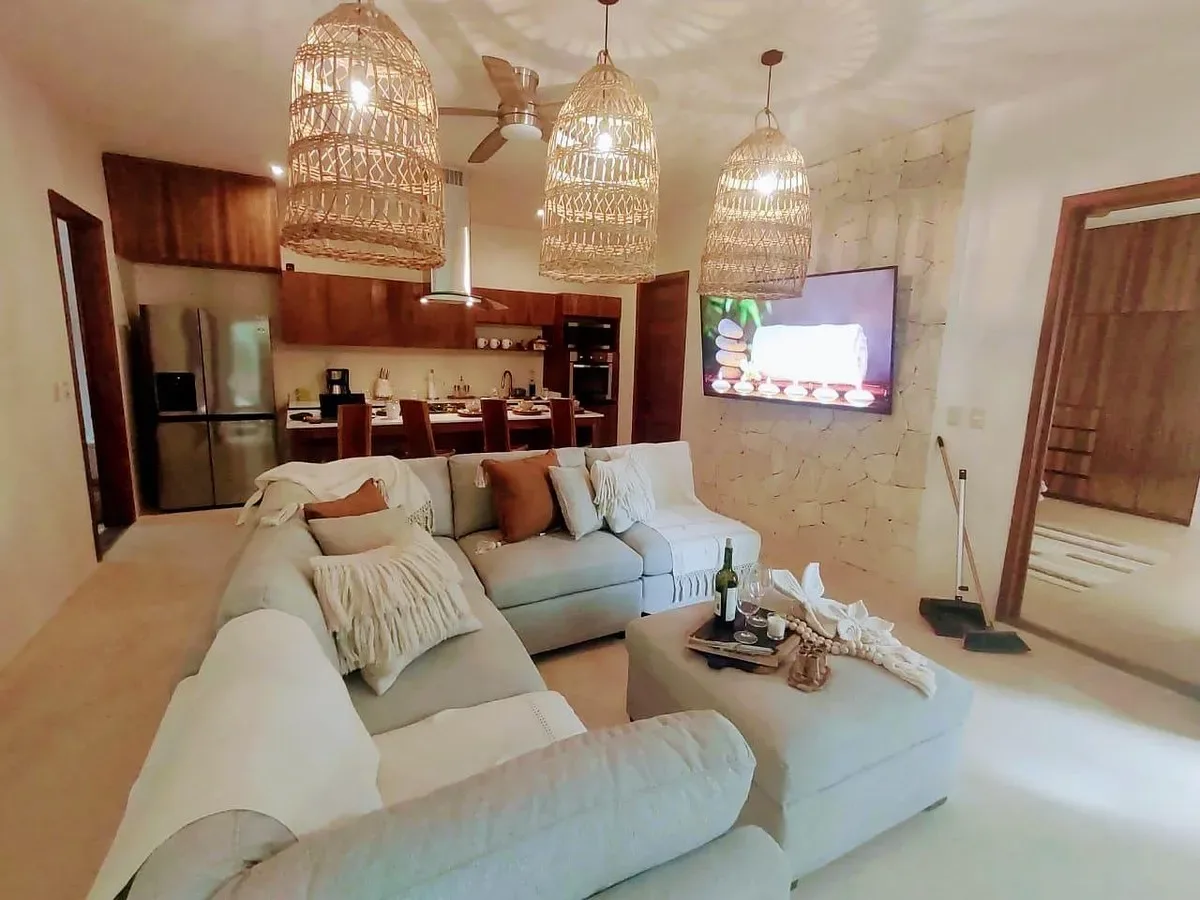 This residential unit is located in Tulum, Quintana Roo. It features 2 lock-off bedrooms, 2 full bathrooms, 1 half bathroom, and an open living area that combines the kitchen, living room, and laundry room.