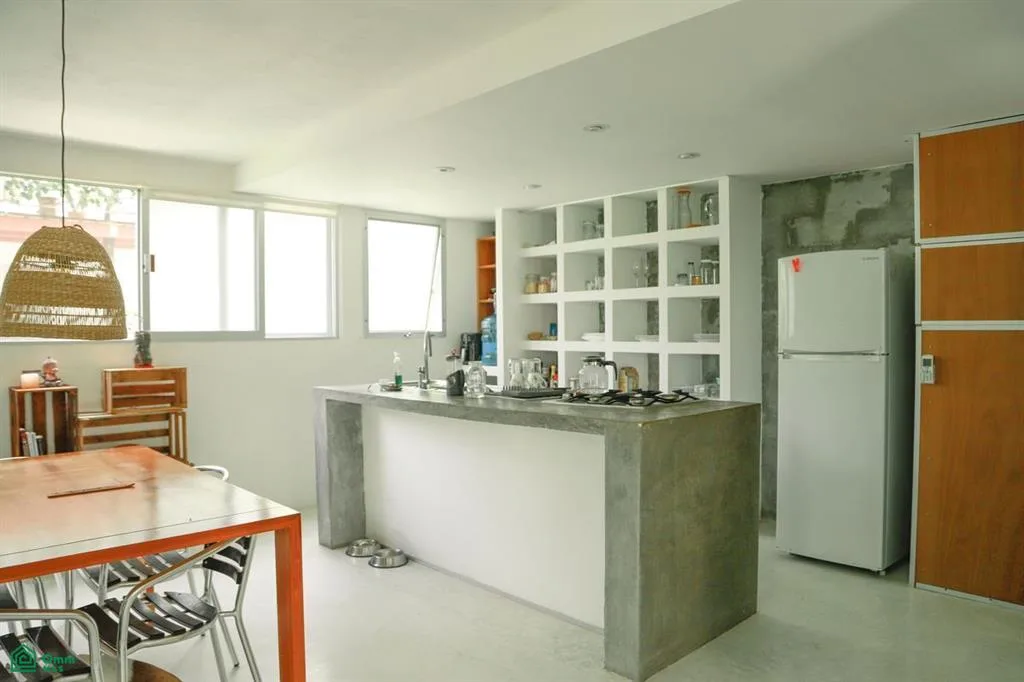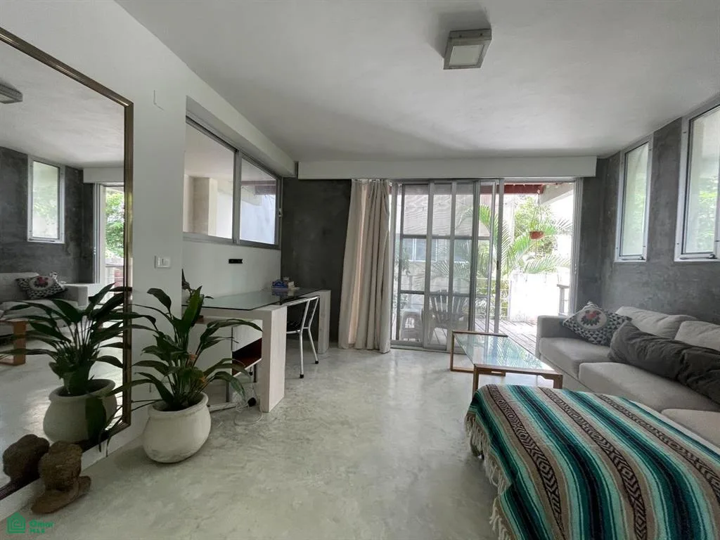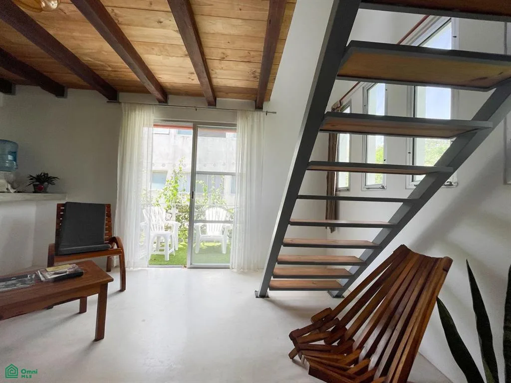 The second tower comprises two apartments. One is a two-story apartment with two bedrooms, 2. 5 bathrooms, a kitchen, and two terraces. The other is a one-bedroom apartment with one bathroom, a kitchen, a terrace, and a rooftop palapa. This tower also has covered parking for two cars.