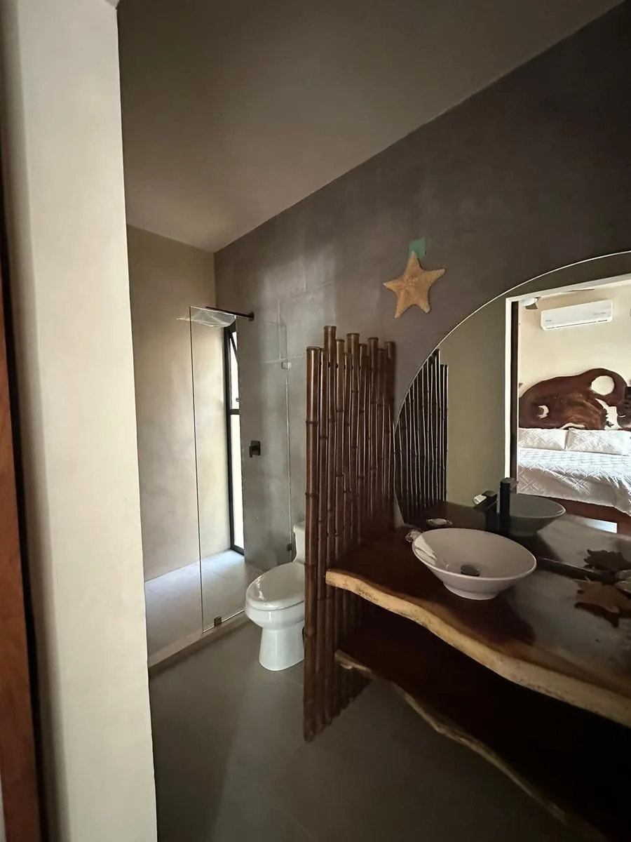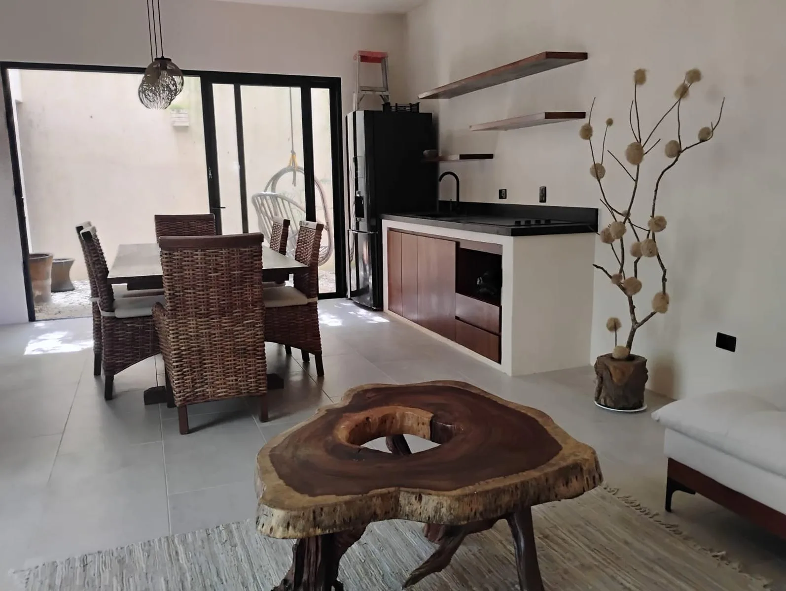 This one-bedroom apartment is located in the Zazil-ha area of Tulum. The unit features one bedroom, one full bathroom, and a private terrace overlooking green areas. The kitchen is equipped, and the apartment includes closets and air conditioning.