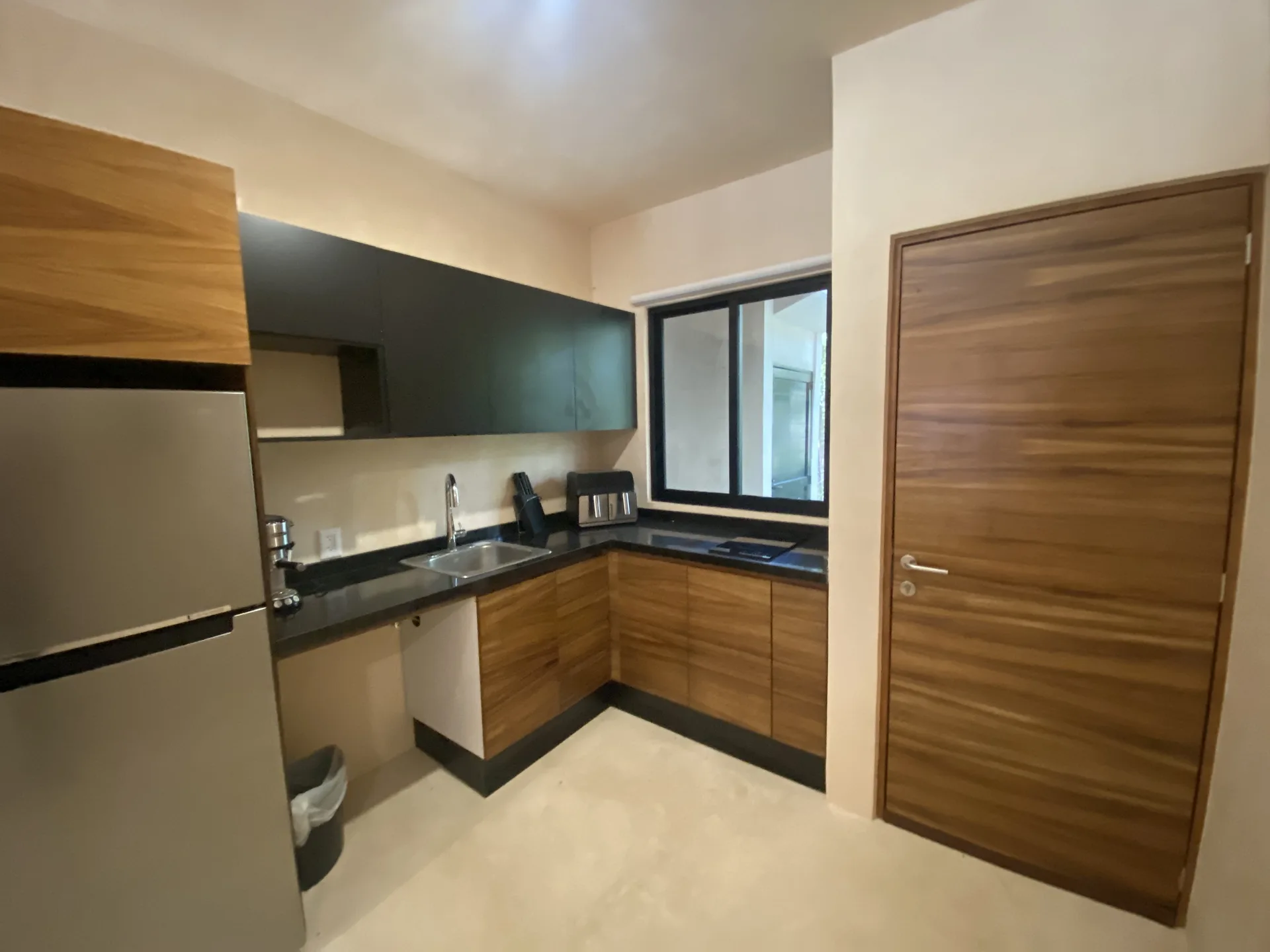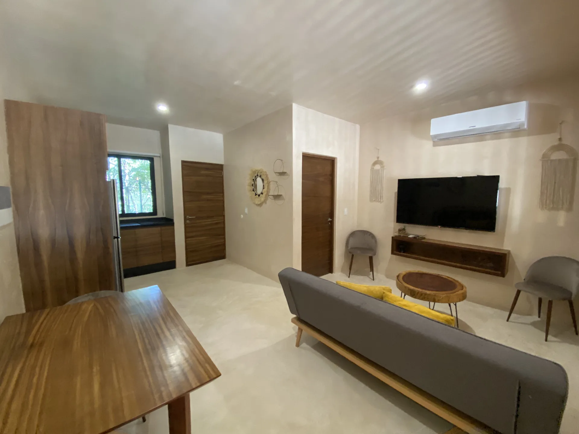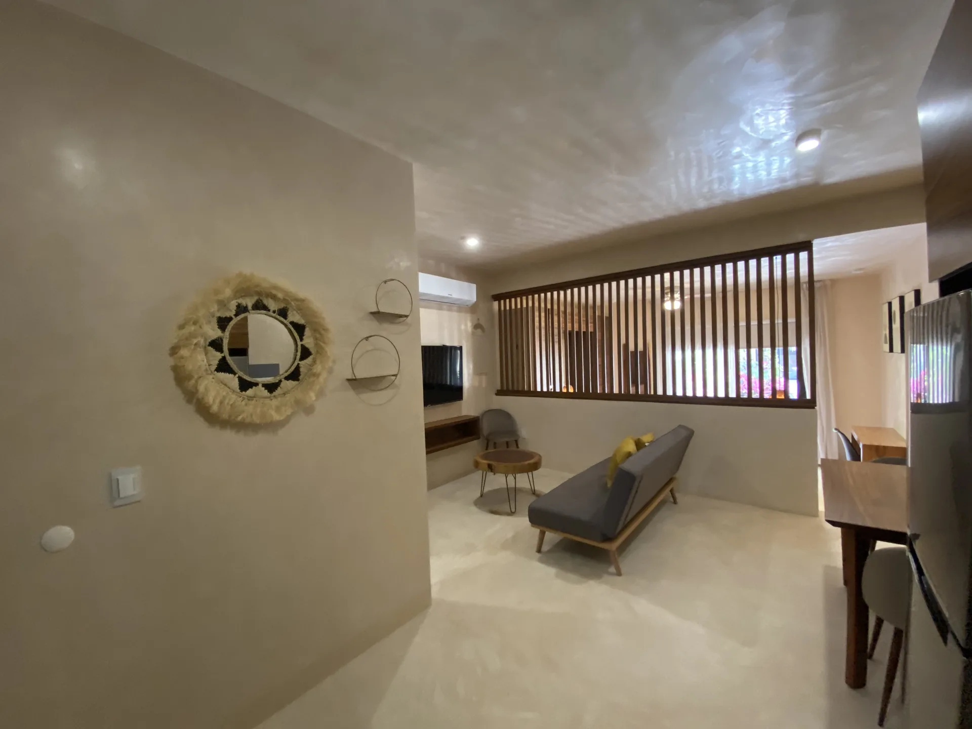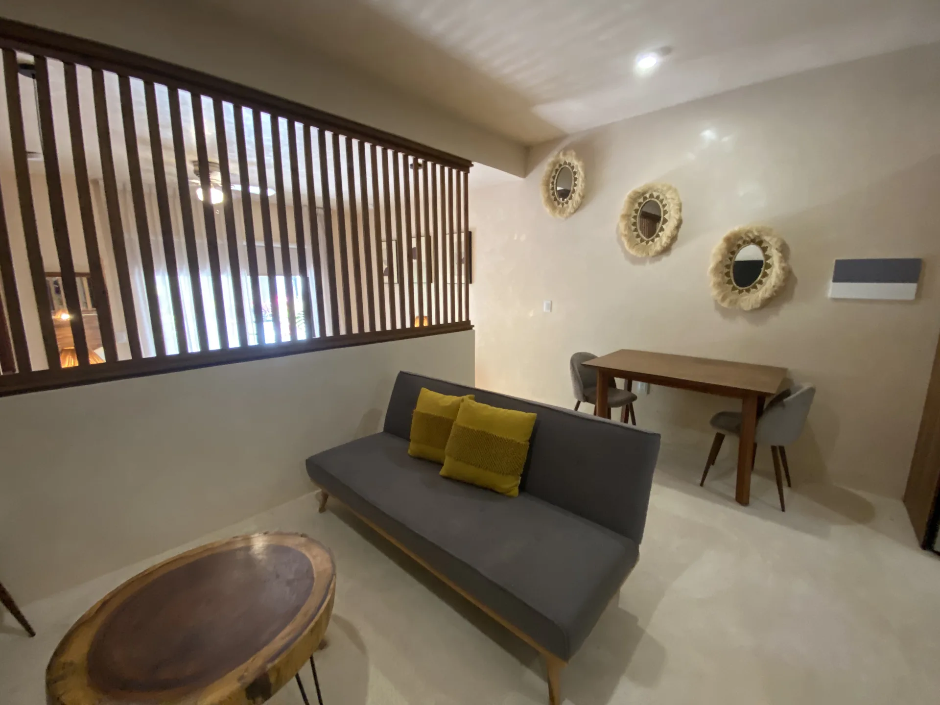 This one-bedroom apartment is fully furnished and features a unique poolside design. It is located within the Areia Phase 2 development in Tulum.