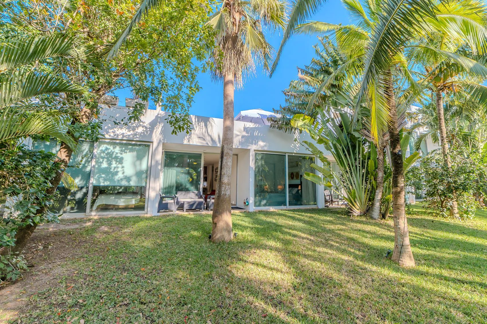 The terrace is substantial and faces a large garden with grass and palm trees. The property includes a swimming pool with a designated lane for swimming and a separate area for children. The pool area is equipped with lounge chairs and outdoor showers.