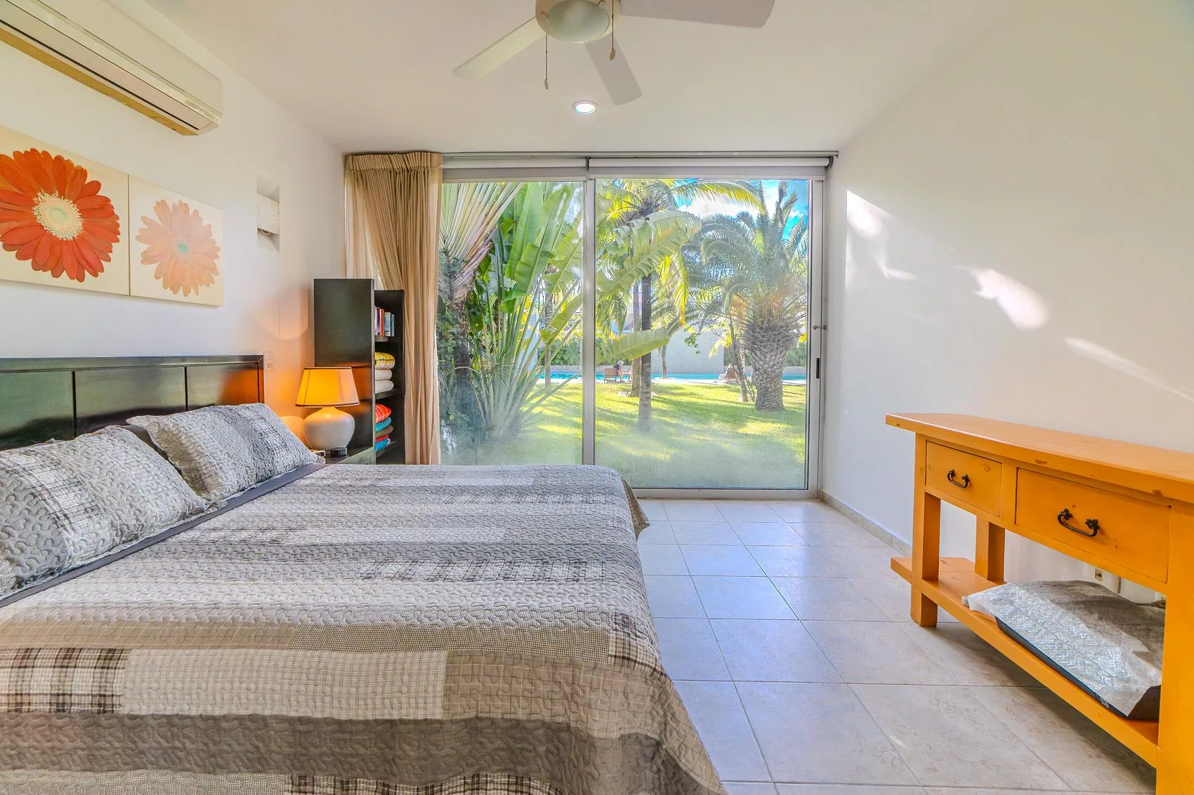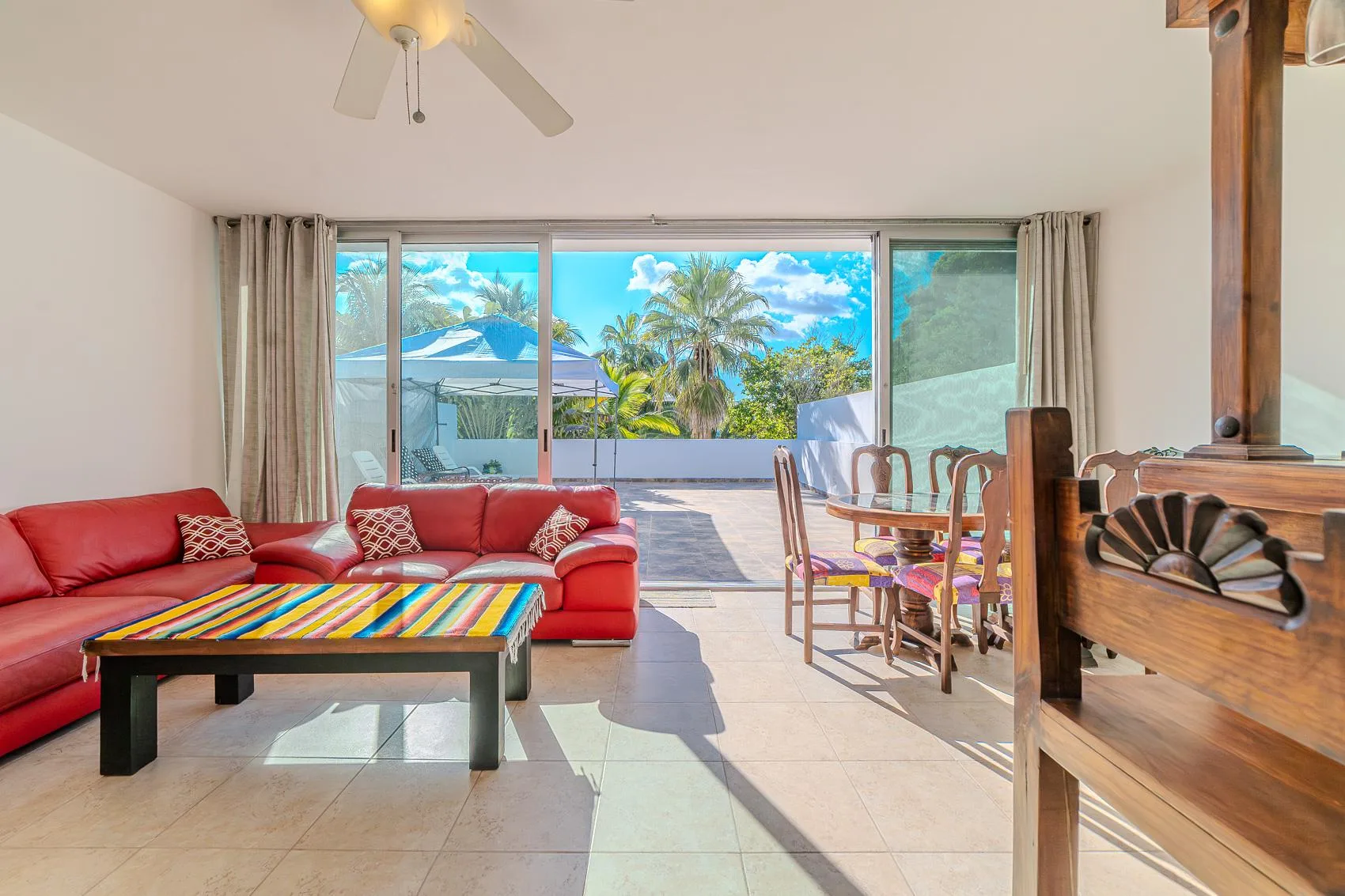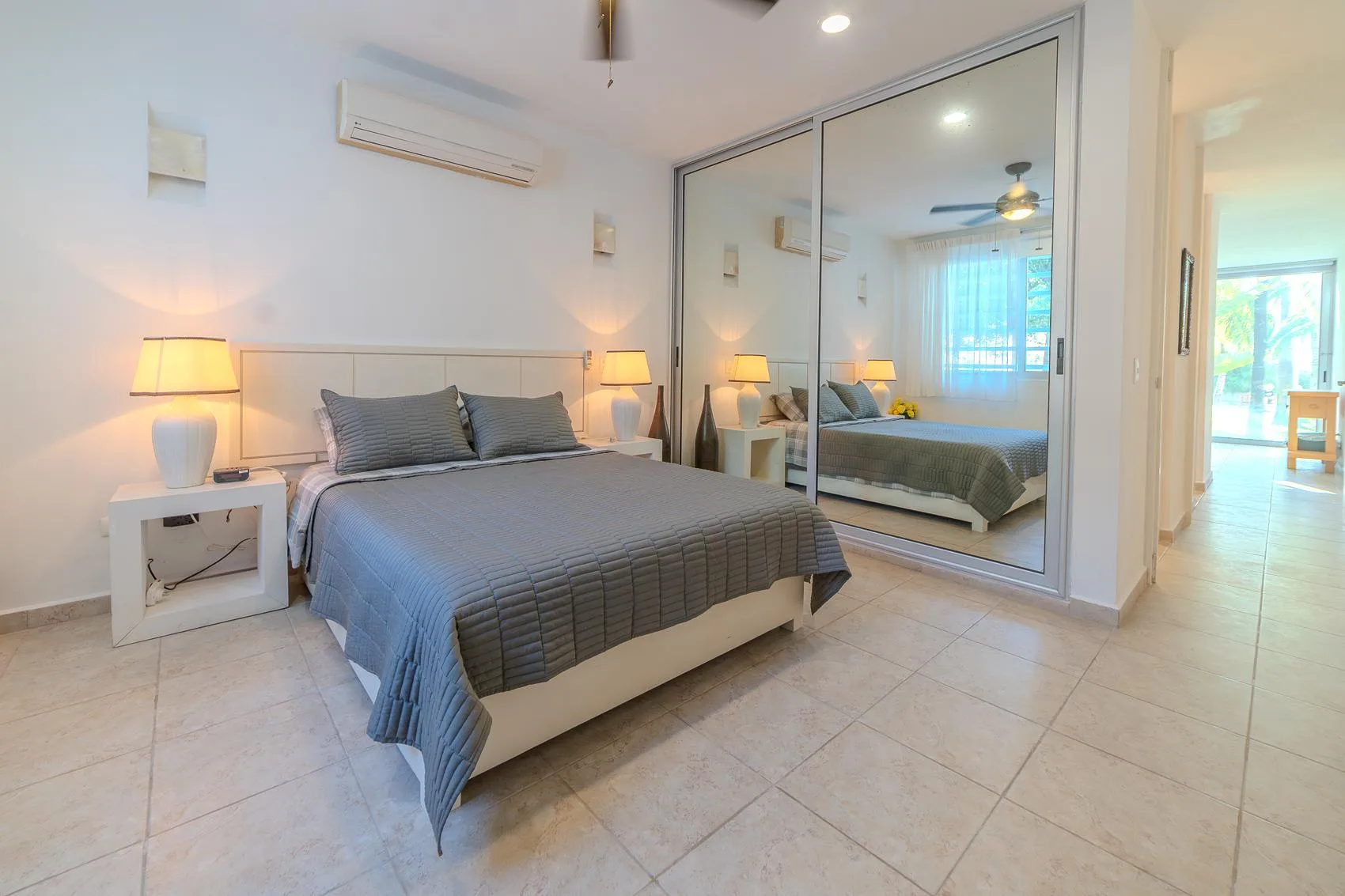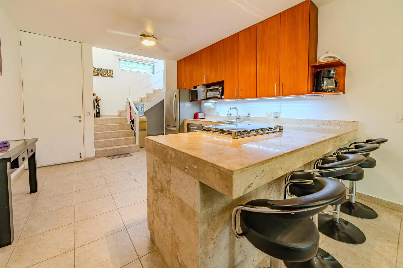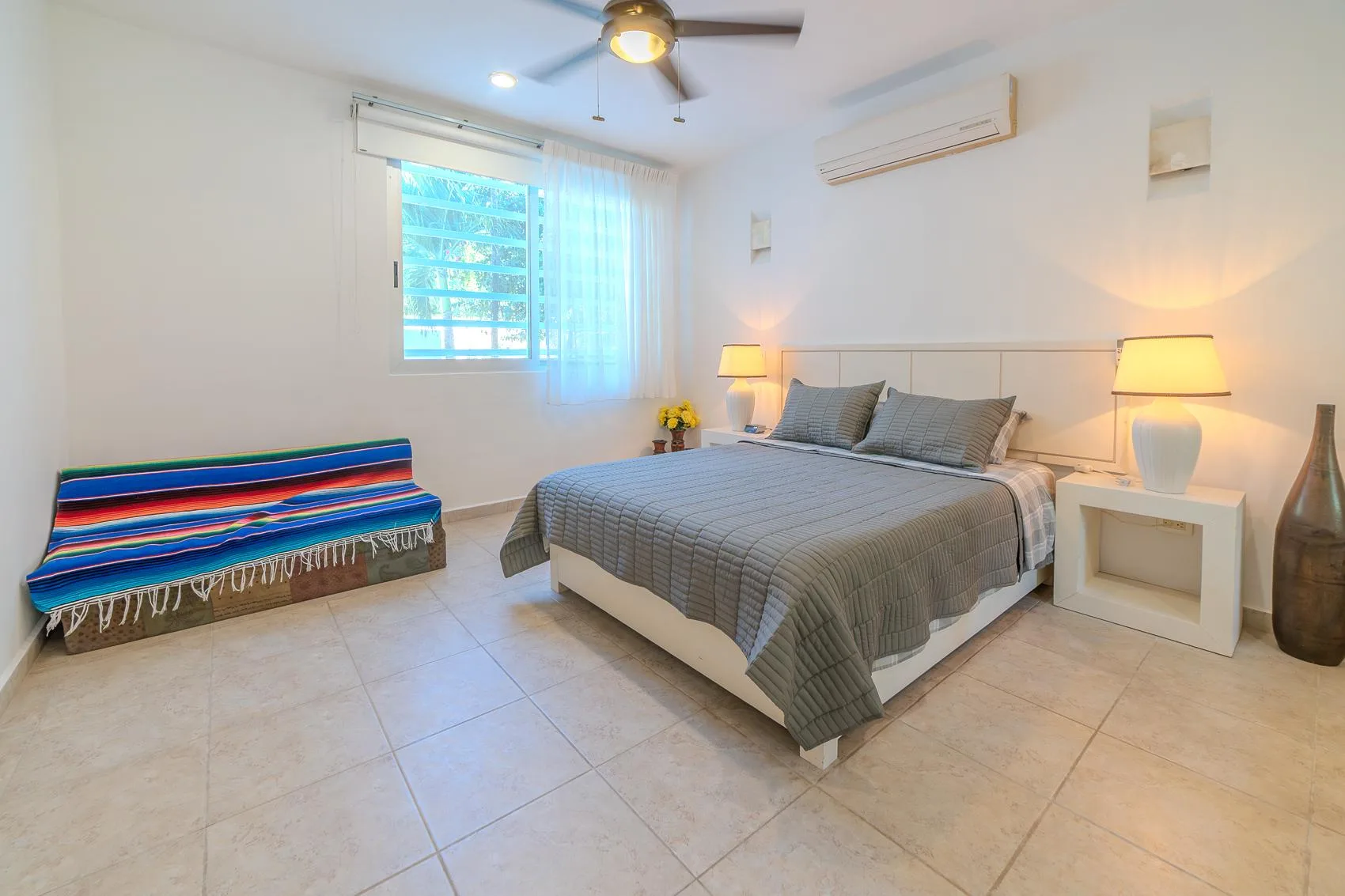 This spacious condo is situated in the heart of Tulum Downtown, on La Selva Avenue near the gypsy market, within the White Condo condominium. It is a two-story property.