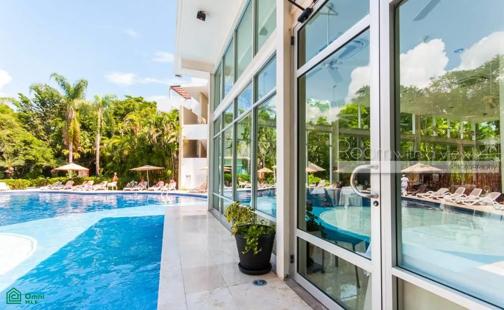 The condominium complex is surrounded by a PGA golf course and is located just minutes from the Caribbean coast. The property includes access to a community pool, a clubhouse, tennis courts, and extensive green areas. The community features a front desk, private roads, and 24-hour security.