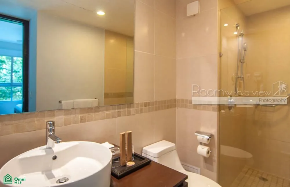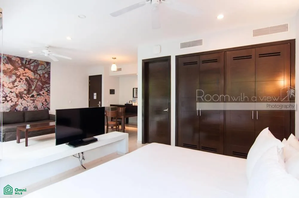 This studio-style condo offers inviting indoor-outdoor spaces within a secure, gated resort community. The unit features a spacious open layout with a kitchenette, a sun-filled living and dining area, and a separate sleeping area with ample closet space. The living area opens to a private balcony with jungle views.
