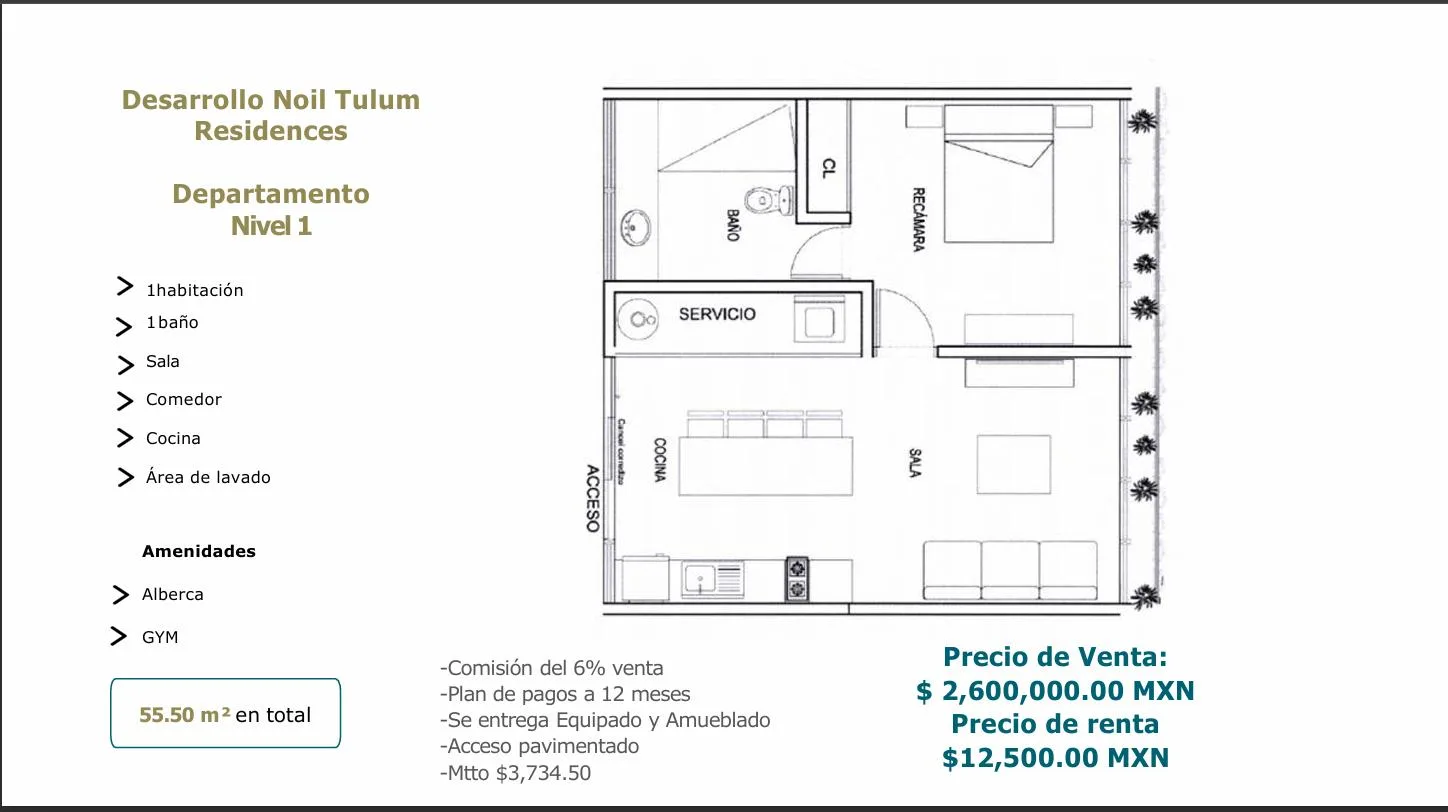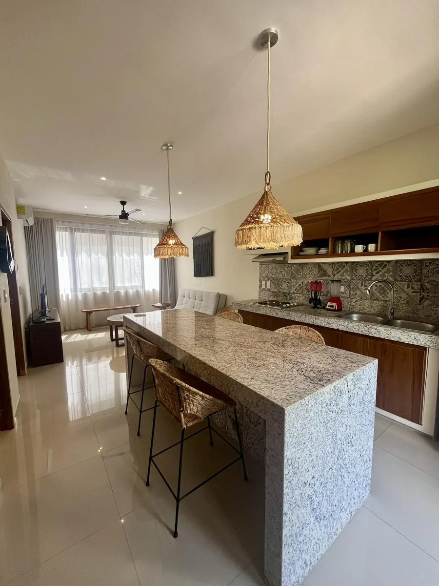 The apartment features one bedroom, one full bathroom, a spacious living room, an integrated dining area, a modern kitchen, and a laundry area. It encompasses 55. 50 square meters and includes high-quality finishes, air conditioning, and considerate details. The unit is fully equipped and furnished, ready for occupancy. Its design emphasizes ecological integration with the surrounding jungle, promoting sustainable living.