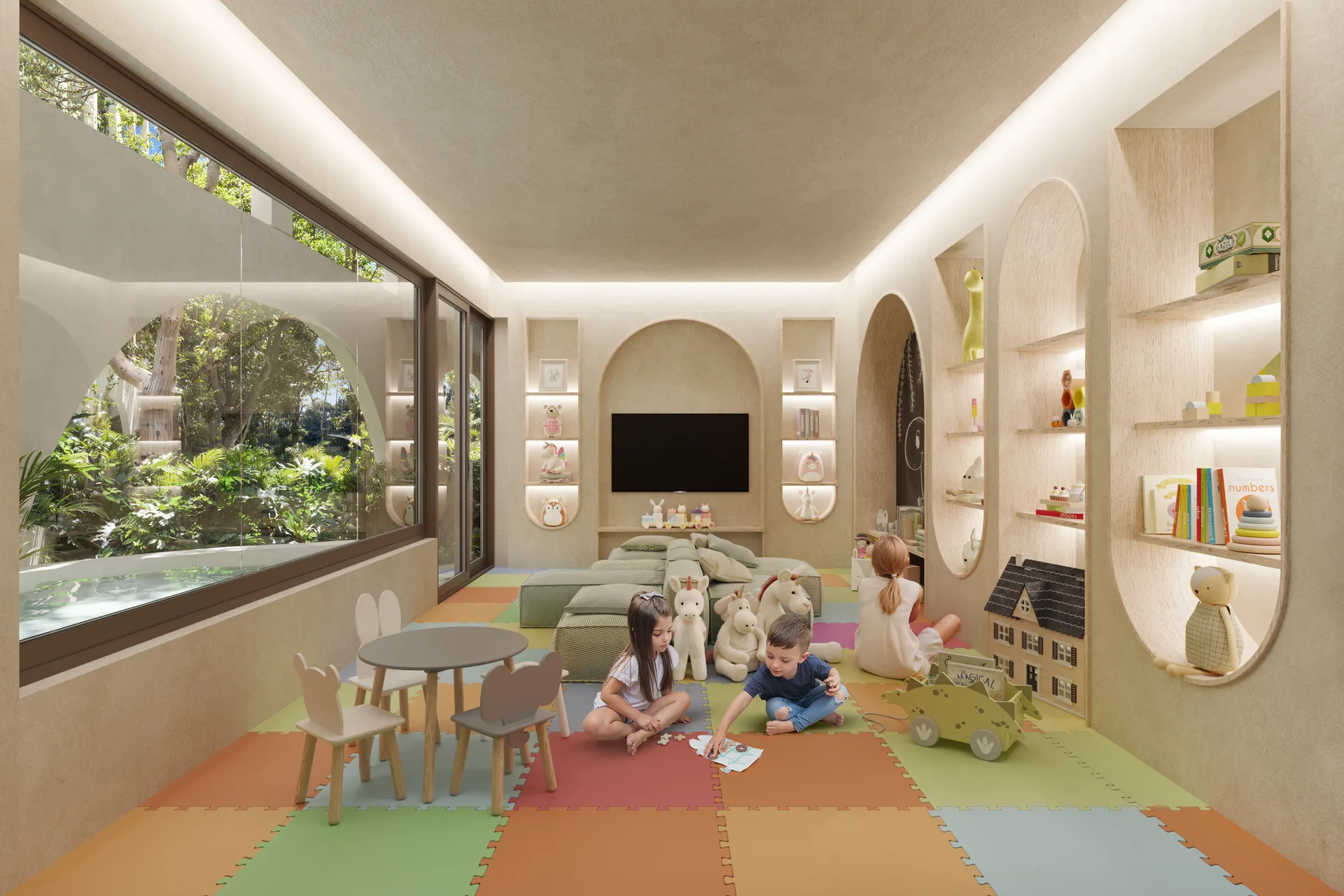 The architectural design masterfully combines tradition and modernity. Arches of various forms and proportions create sculptural volumes and an organic play of light and shadow. Green areas flow between the spaces to provide an atmosphere of natural harmony.