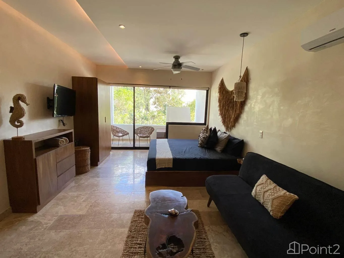 This is a fully furnished and equipped studio for sale in Aldea Zama, Tulum, within the Riviera Maya, Mexico. The unit has a total constructed area of 48 square meters. It is configured as a studio layout with one full bathroom. The property is one year old and in excellent condition.
