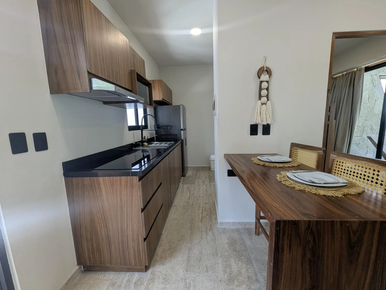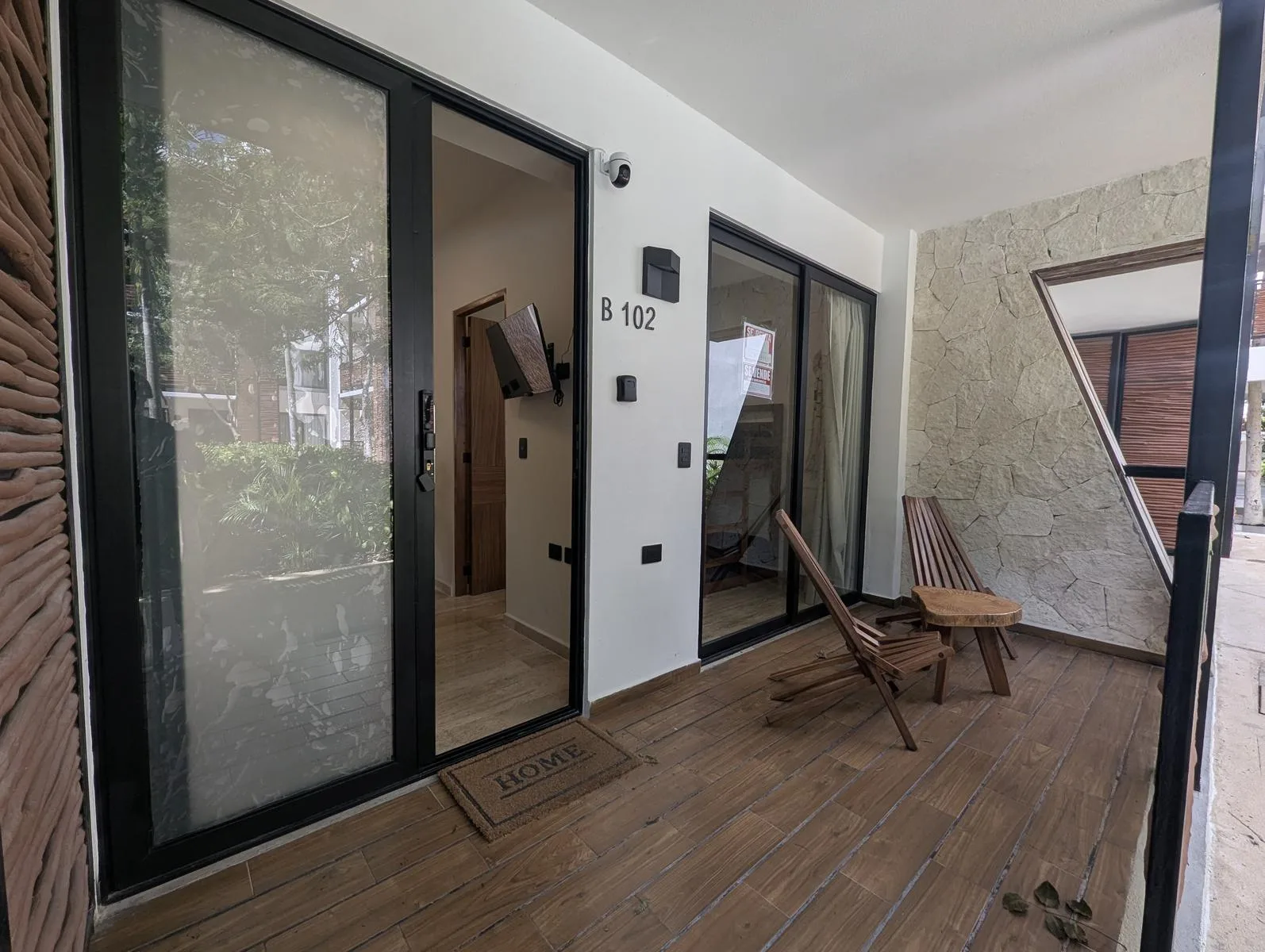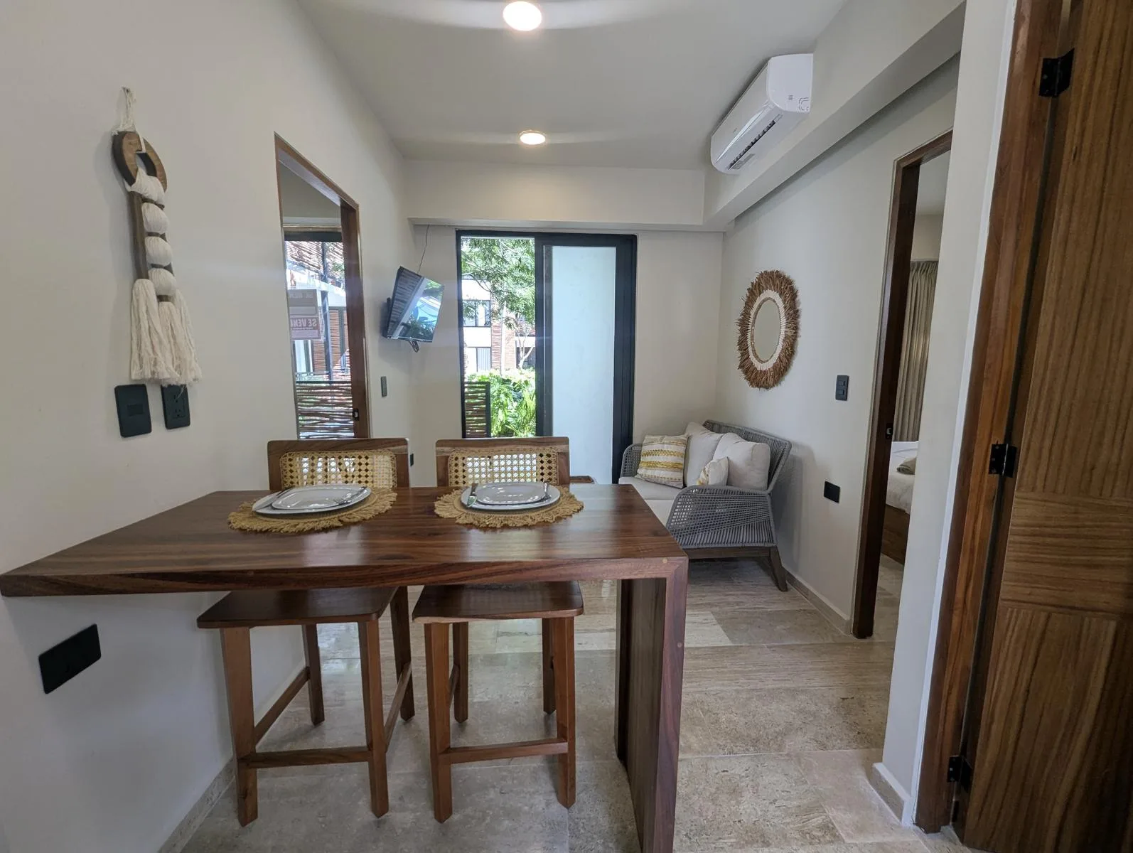 The interior includes an equipped kitchen, a bar and dining area, and a living room with space for a television. The unit offers a private mini garden and a private Jacuzzi for outdoor relaxation.