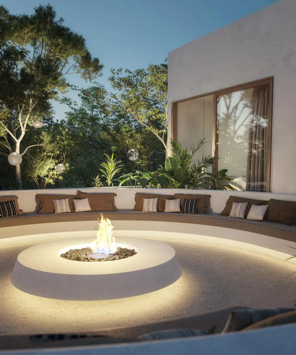The residence includes three bedrooms and five bathrooms. Among its standout features are a dedicated yoga zone, a swimming pool, a private cinema, and a fire pit area.