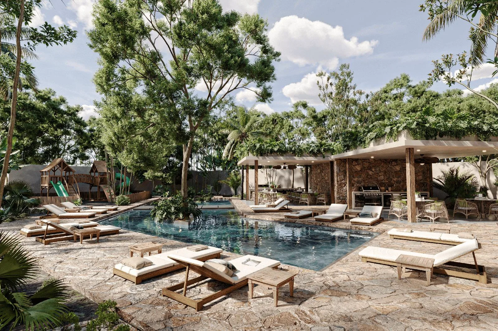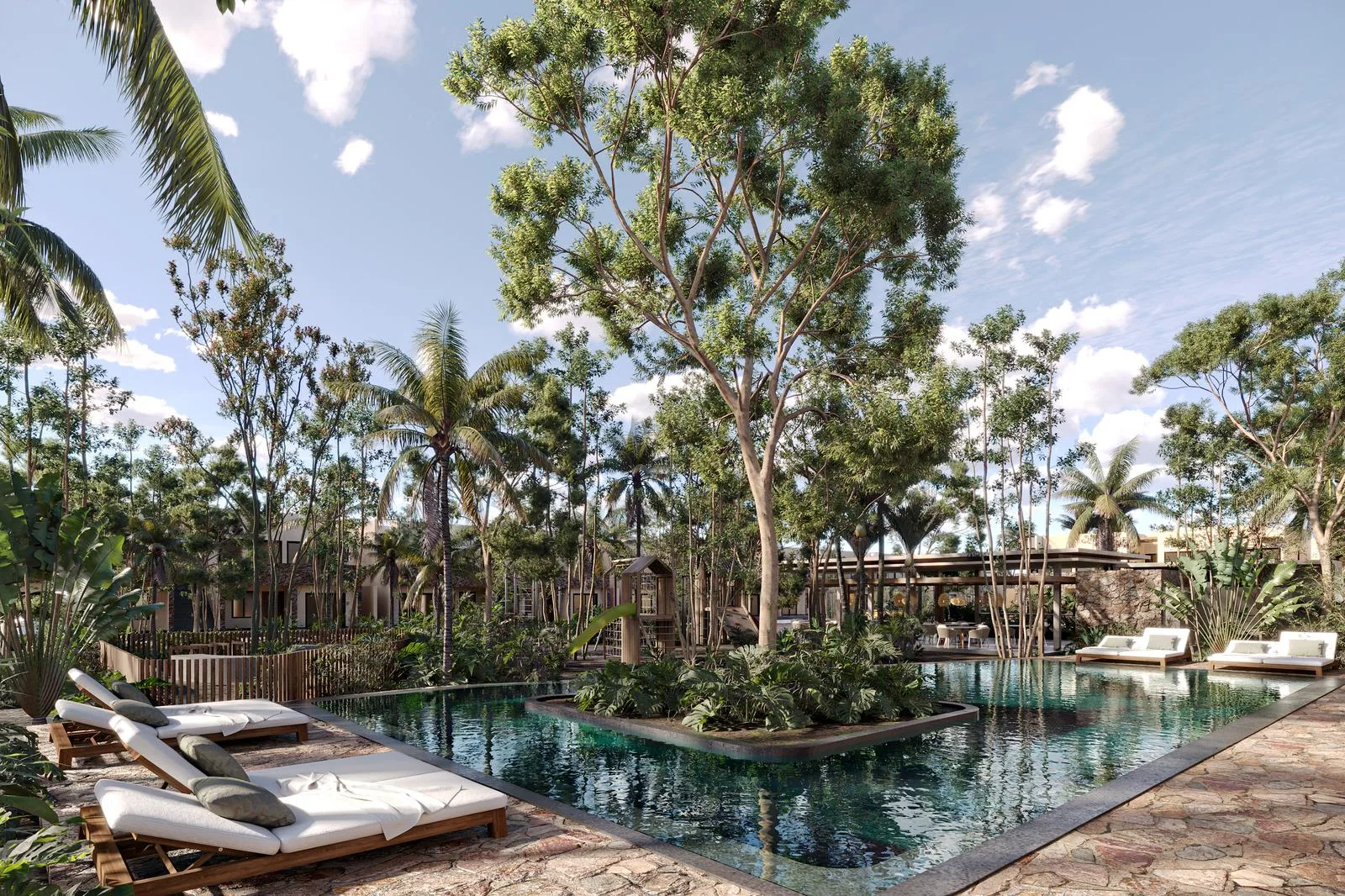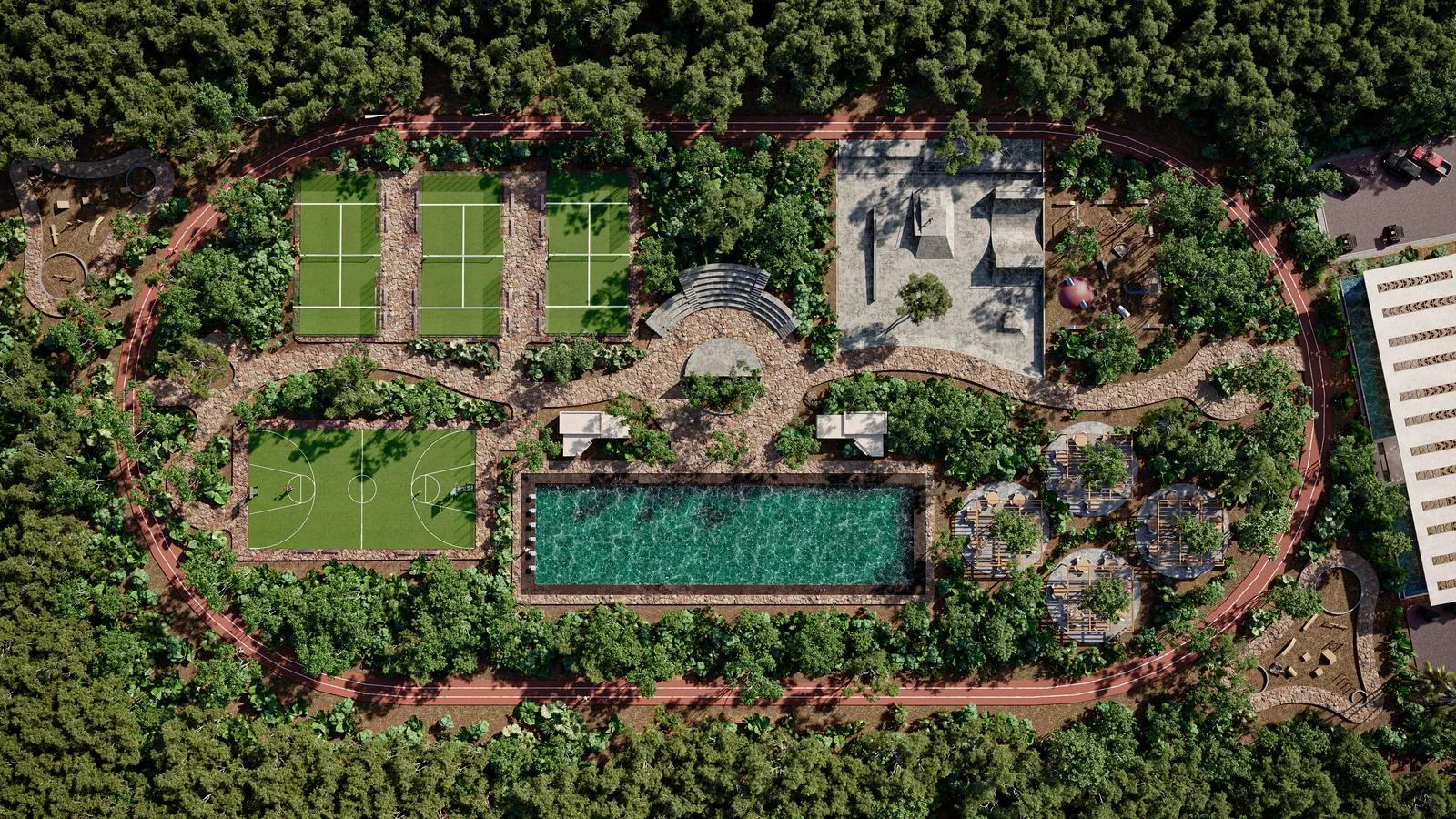 The development features multiple swimming pools, including an Olympic-sized pool, and provides access to natural cenotes. Recreational facilities include a paddle court, tennis court, a multi-sports court, a skate park, a running circuit, and an outdoor cinema. There is a pet park, a children's play area, and a designated kids' zone.