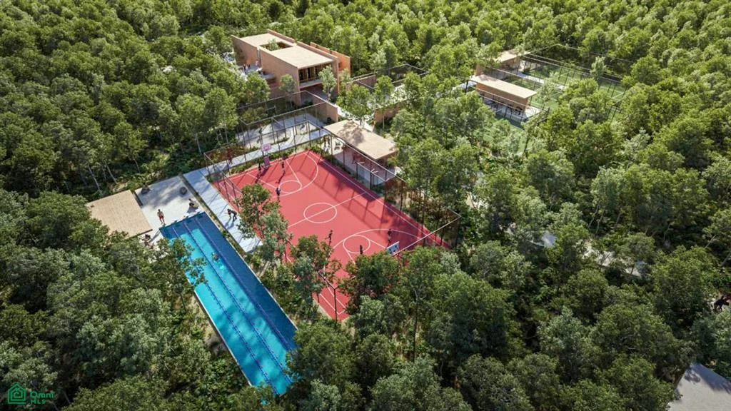 Community amenities include a skate park, a cenote club, and multiple pools such as lounge, family, salt water, jacuzzi, teen, and kids pools. There is a children's playground, trails surrounded by vegetation, and sports courts for tennis, paddle tennis, basketball, and pickleball. Additional features are a gastro club with a pizza oven and grills, a yoga studio, indoor and outdoor gyms, an orchard, a pet park, four swimming lanes, a business center, a retail area, an outdoor cinema, wildlife crossings, and a bike path.