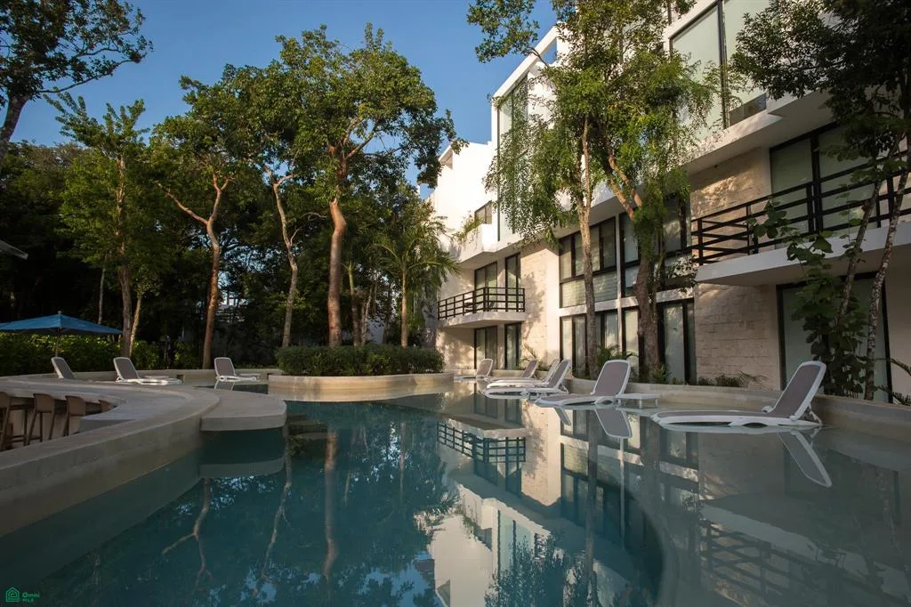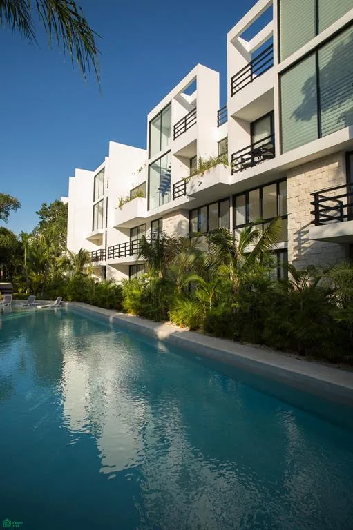 The penthouse is located within the Tulum Country Club & Golf hotel and residential complex. The development features white facades combined with natural elements, integrating the architecture with the surrounding environment.