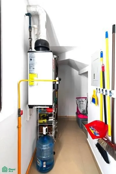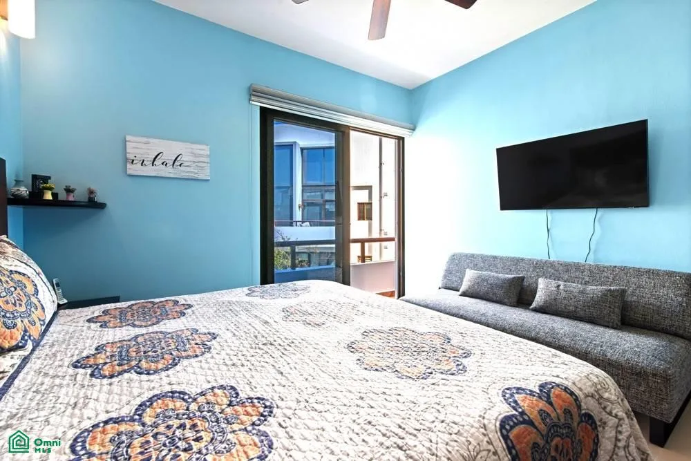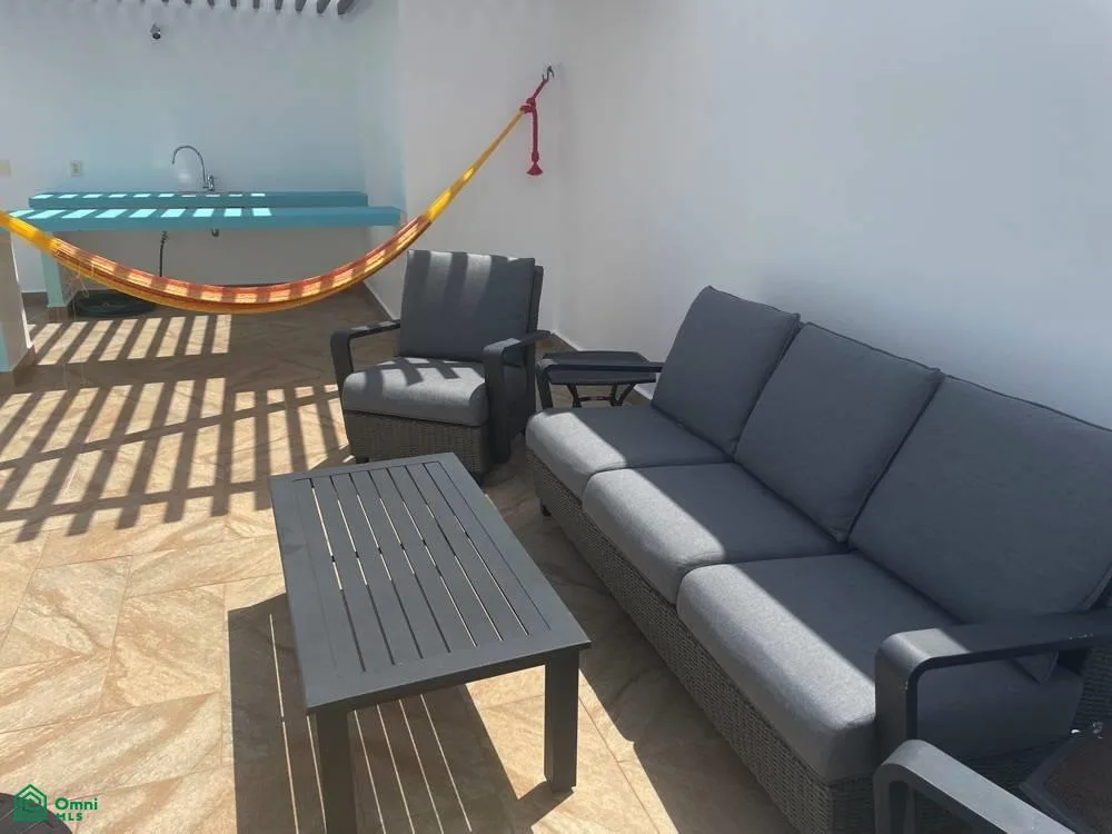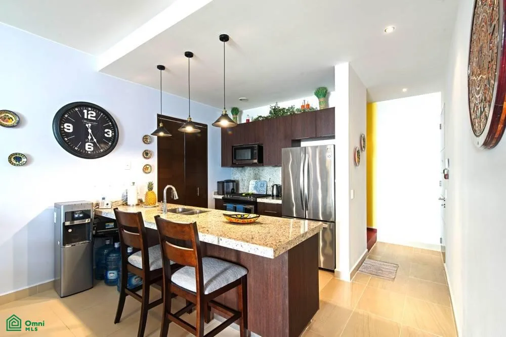 This penthouse features two bedrooms and two bathrooms. The spacious open floor plan is filled with abundant natural light. The fully equipped kitchen includes an island. A wide balcony with an outdoor grill provides additional living space, and a staircase leads to a private rooftop terrace equipped with a jacuzzi.