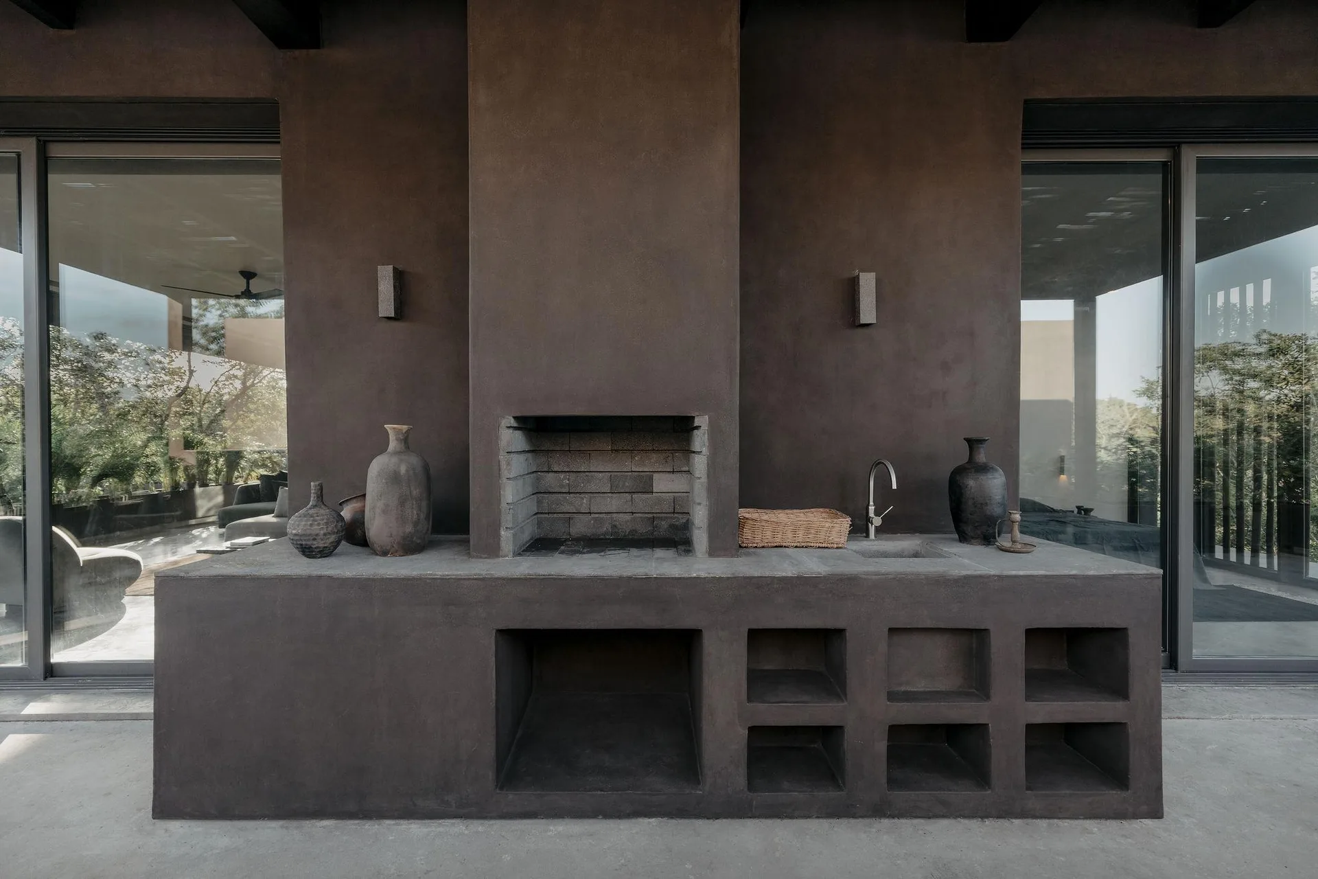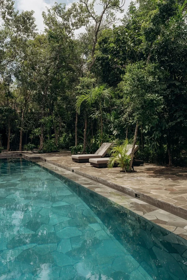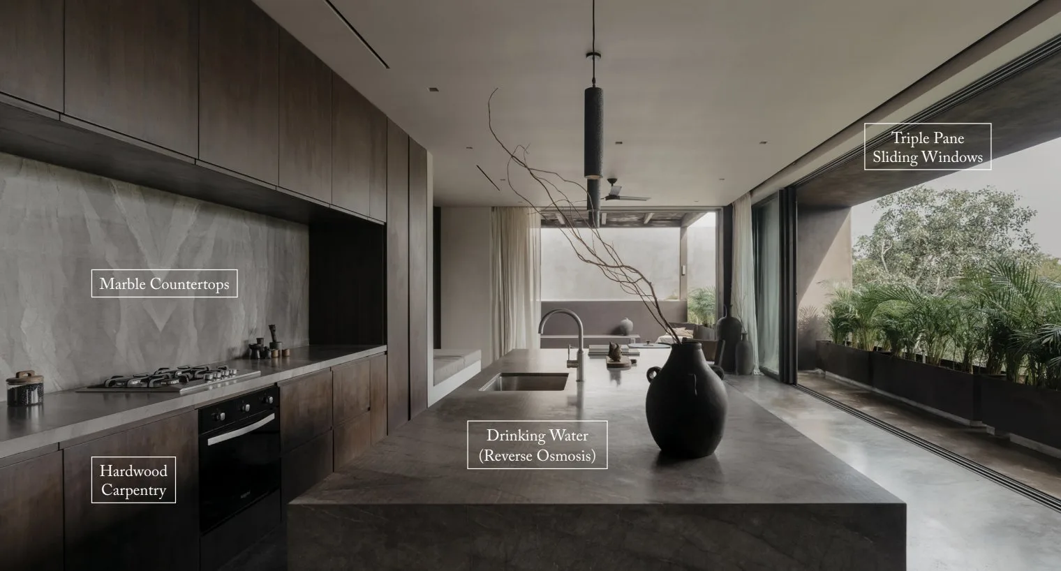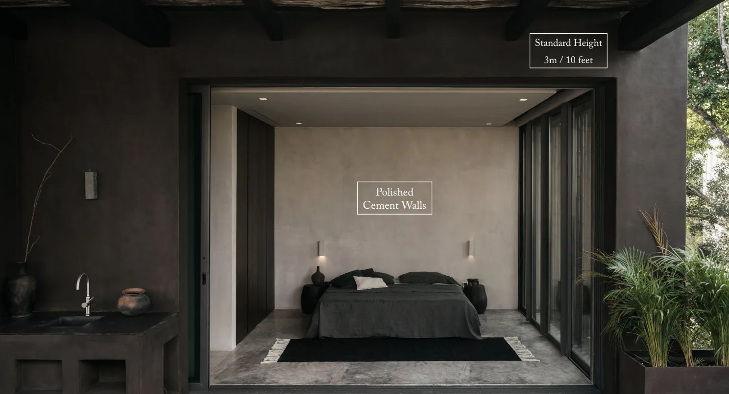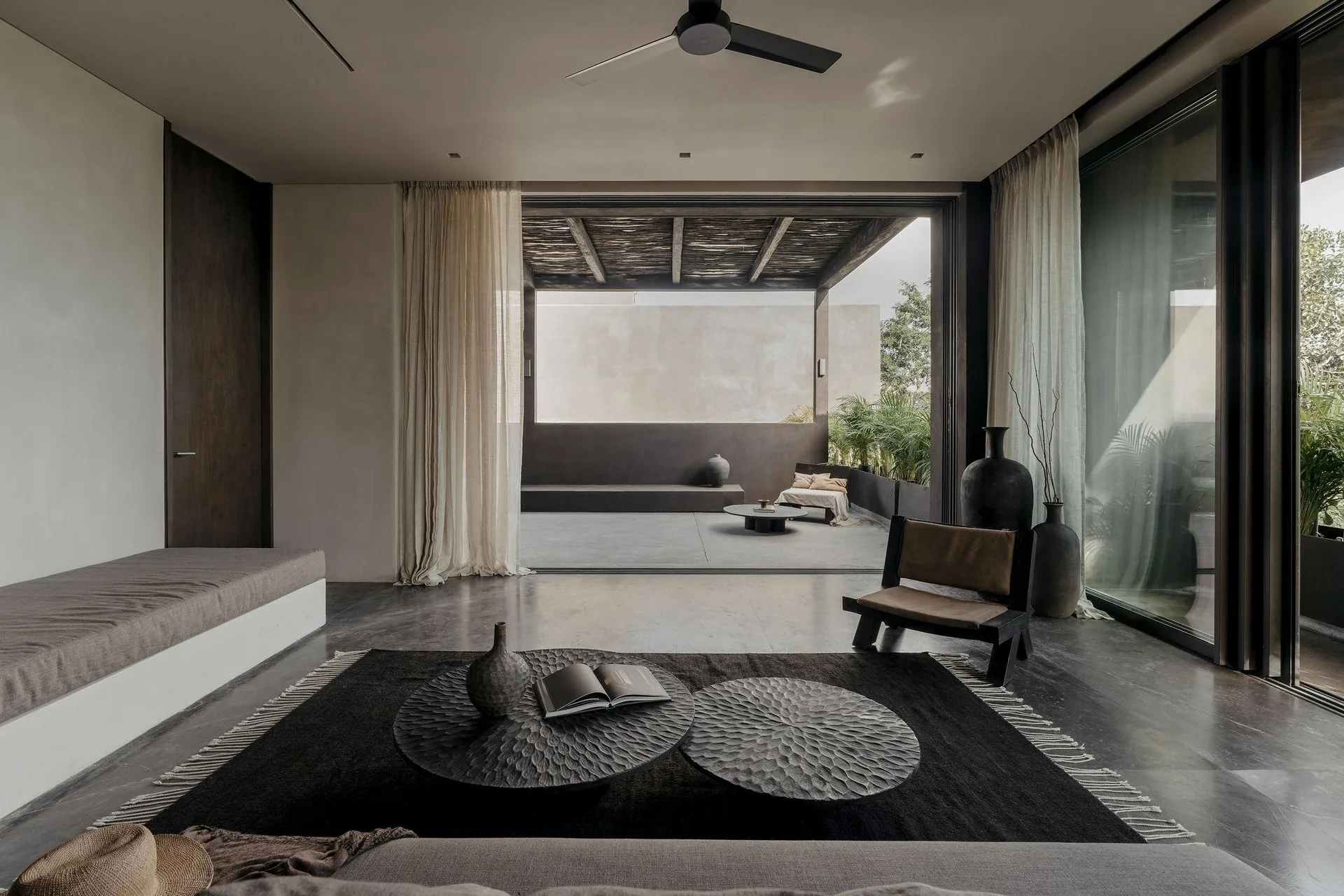 The residence is situated within a lush, jungle-like setting offering complete privacy. Its design embodies a wabi-sabi aesthetic, creating a seamless indoor-outdoor feeling.