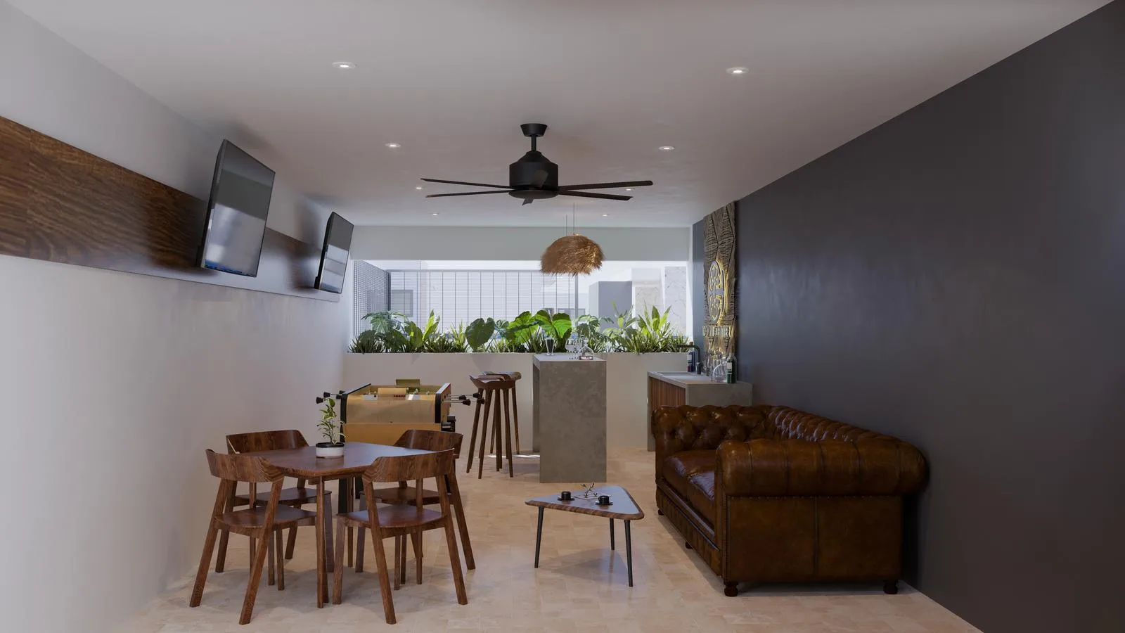 Building amenities include a lobby, gym, coworking space, swimming pool, cinema, laundry facilities, management services, lounge chairs, a bar, a playroom, a terrace, a game room, and a pool table.