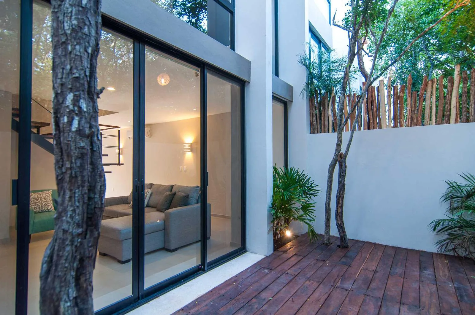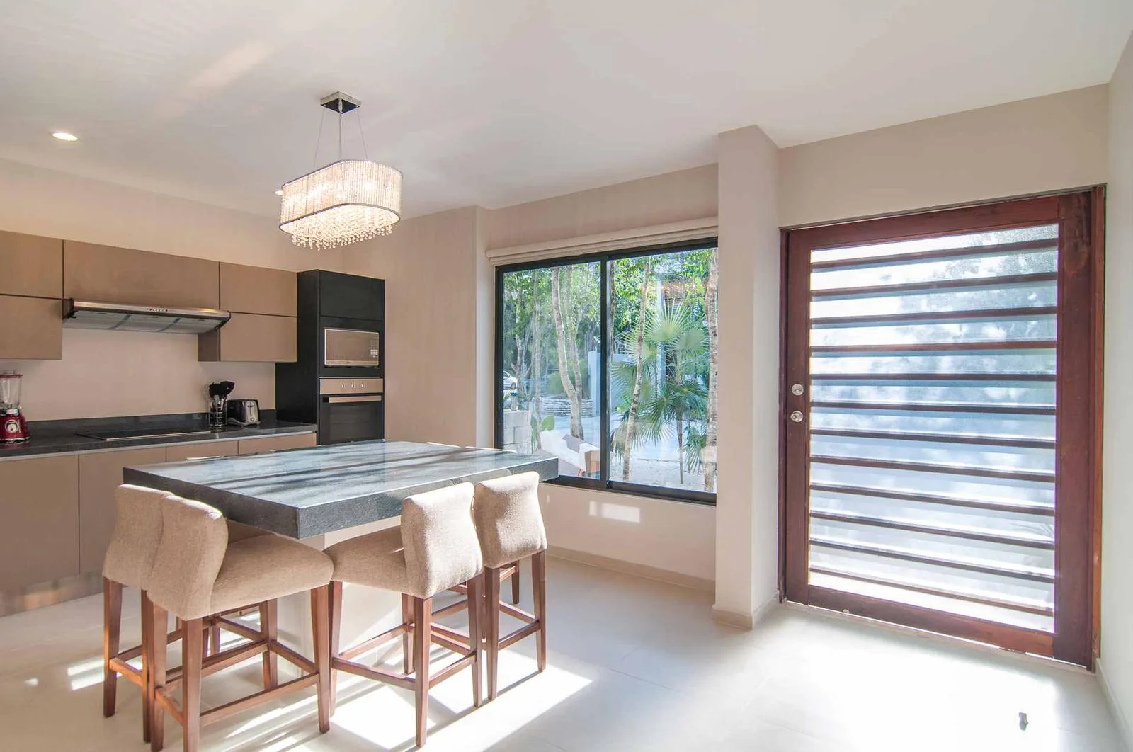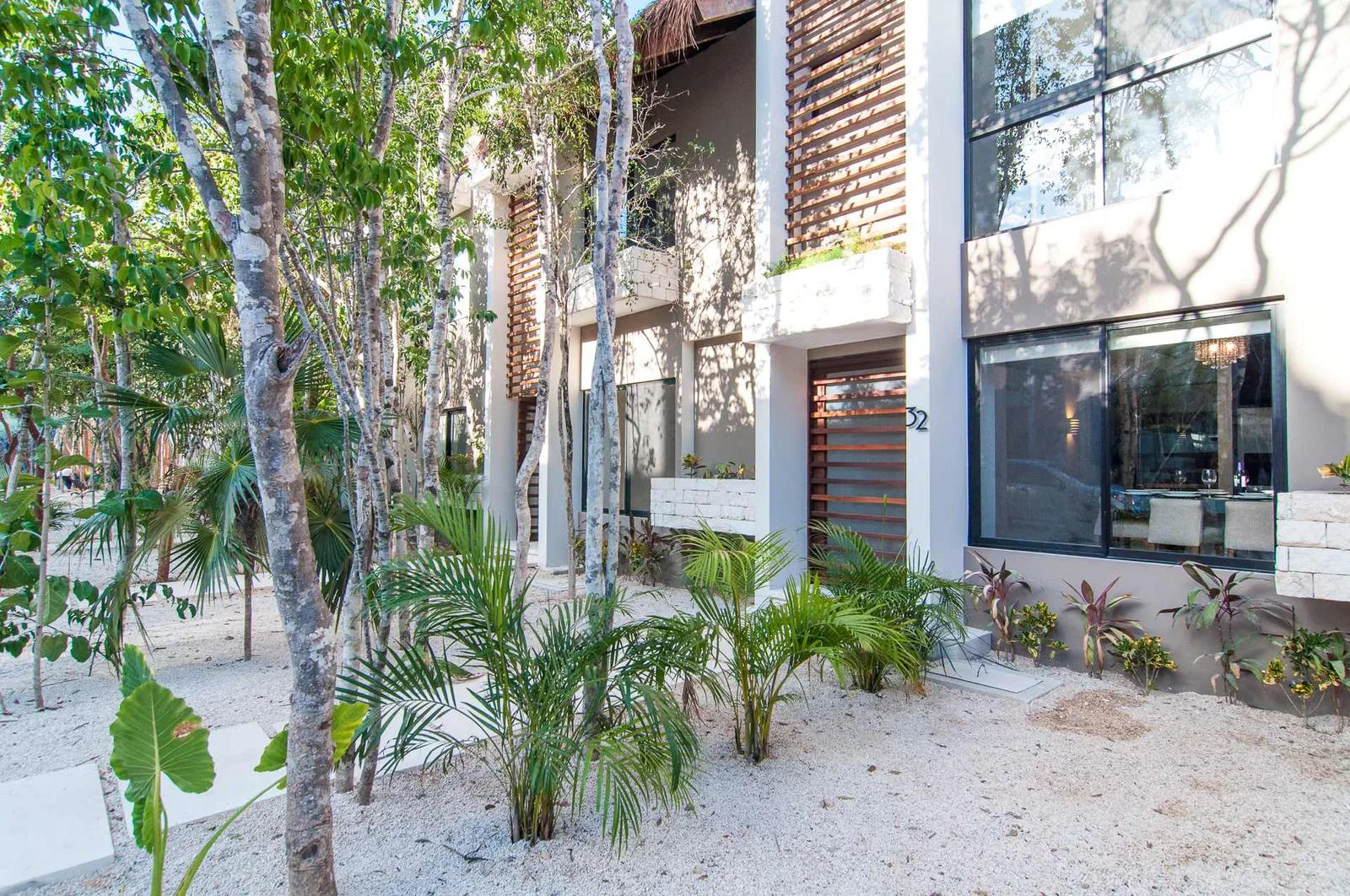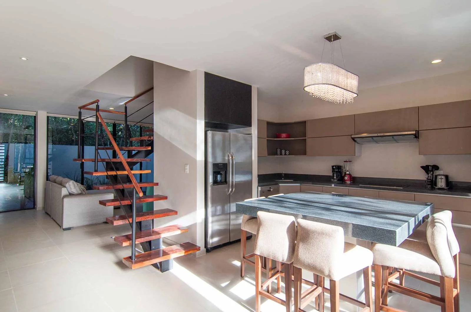 Upon entering the villa, a floating wooden staircase and floor-to-ceiling windows that connect to the outdoor patio integrate the space with nature. The entry level includes a spacious kitchen with a granite island and surrounding cabinets. This level also houses a half bathroom, a living room, and a private patio with tropical landscaping and a hardwood deck.