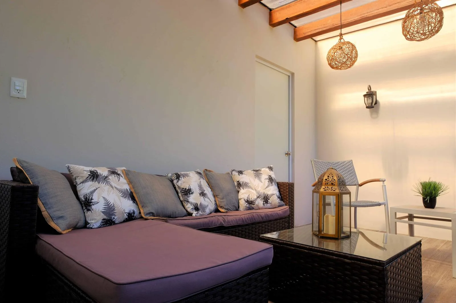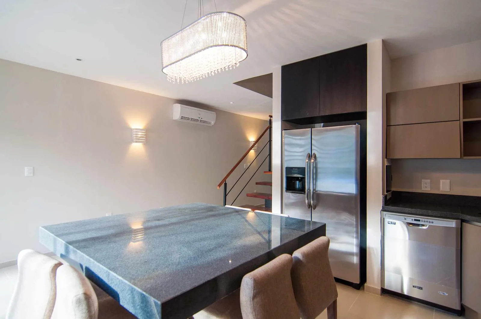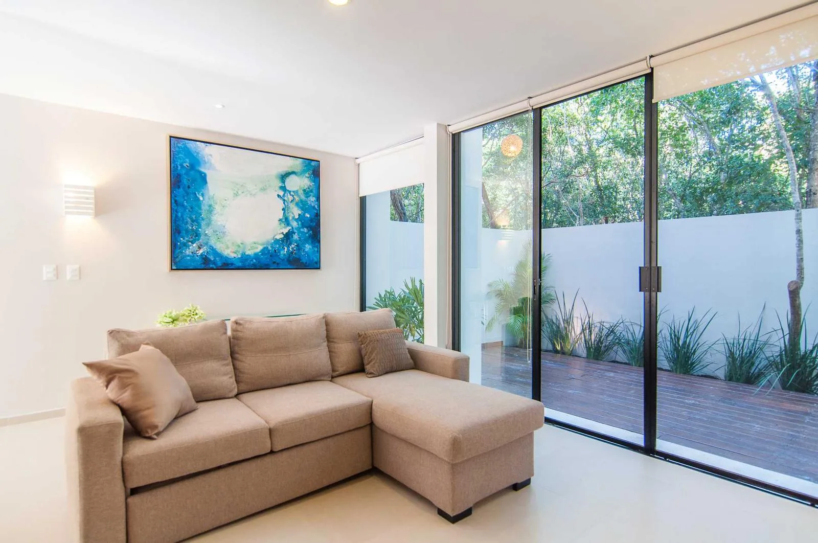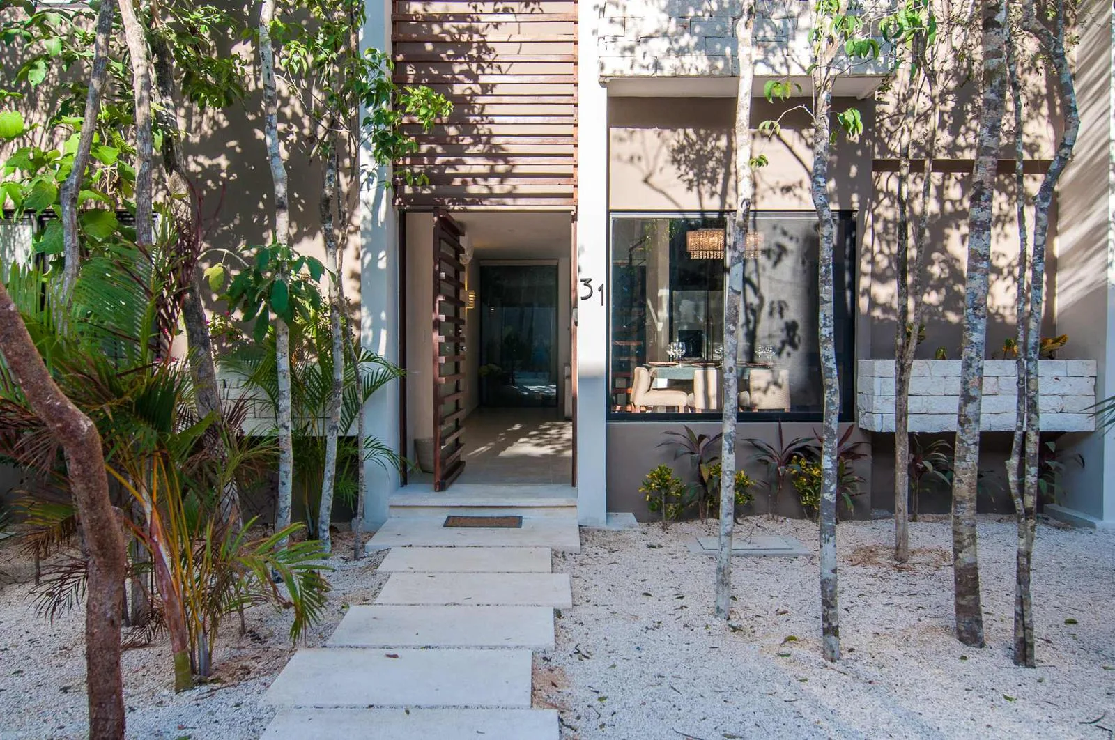 Upon entering the villa, a floating wooden staircase and floor-to-ceiling windows that connect to the outdoor patio integrate the space with nature. The entry level includes a spacious kitchen with a granite island and surrounding cabinets. This level also houses a half bathroom, a living room, and a private patio with tropical landscaping and a hardwood deck.