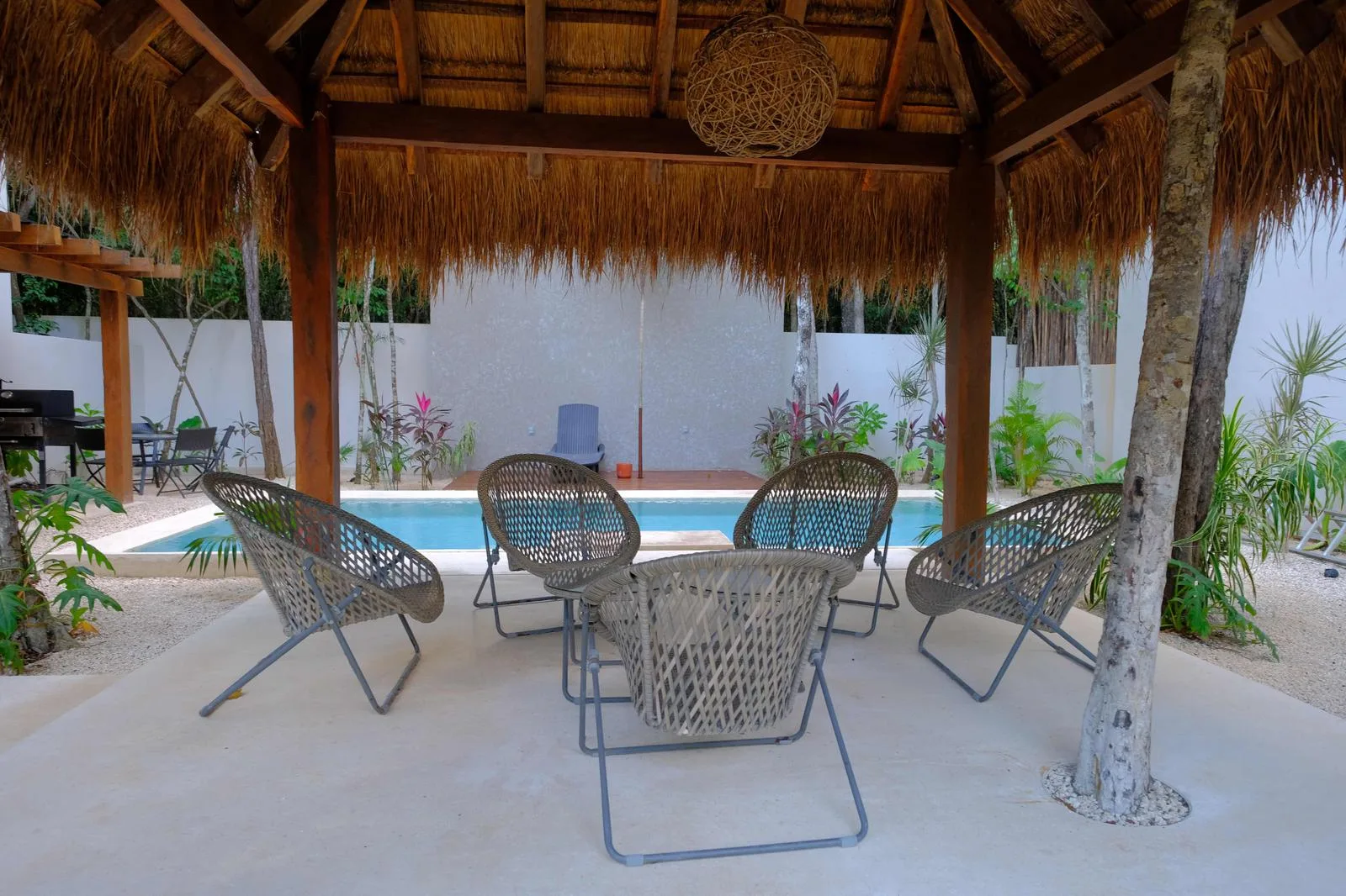 The gated community includes parking in front of each villa, two swimming pools with social palapas and sunbathing areas, and a barbecue zone.