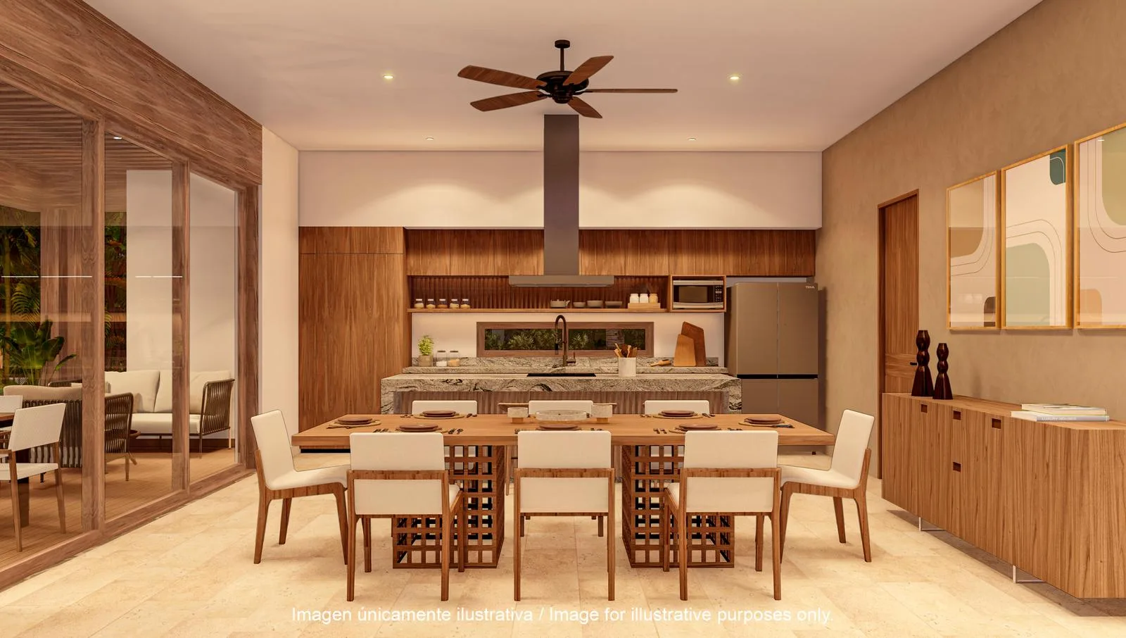 The architectural design maximizes natural light, cross ventilation, and a seamless connection to the gardens. The ground floor contains the primary social areas and features a connection to the outdoors. It includes a main living room with views of the pool and garden, a spacious dining room, and a gourmet-style kitchen with a central island and breakfast bar. A covered terrace integrates with the exterior area, and there is a private swimming pool surrounded by tropical landscaping. An additional living space can function as a TV room or office, and a strategically placed half bathroom is available for guests.
