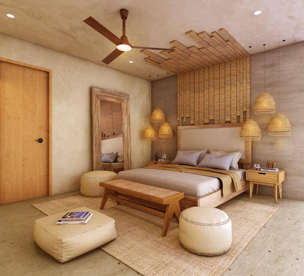 The interior features an open-plan layout that creates a seamless flow between the living, dining, and kitchen areas. The design incorporates a bohemian style with local materials such as chukum and tzalam wood.