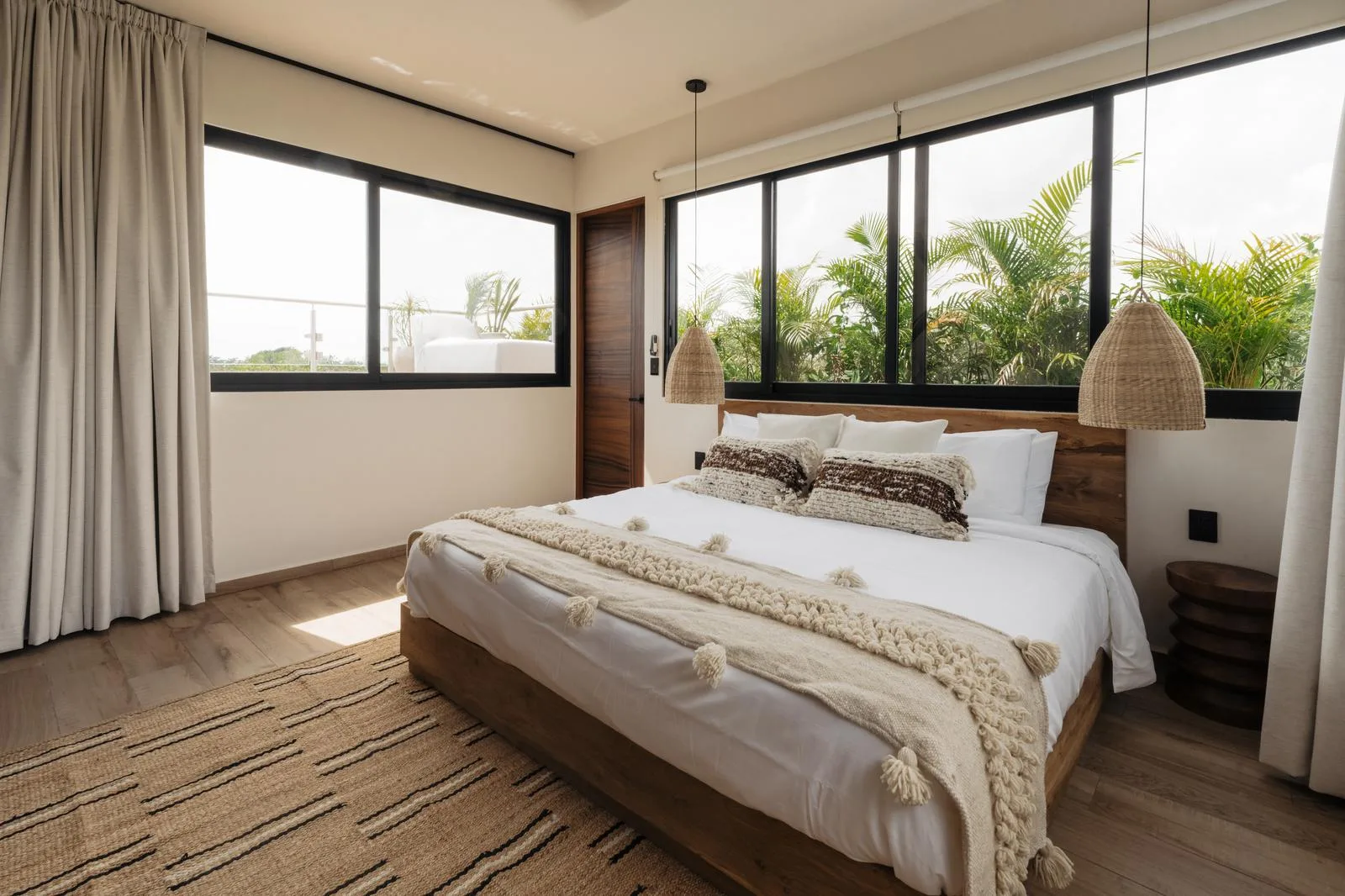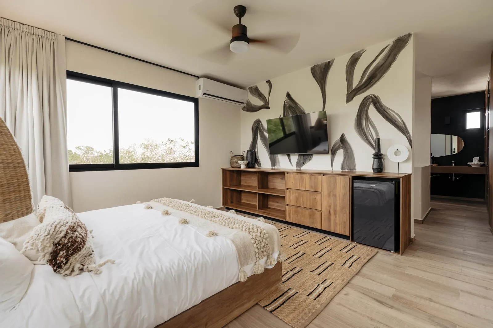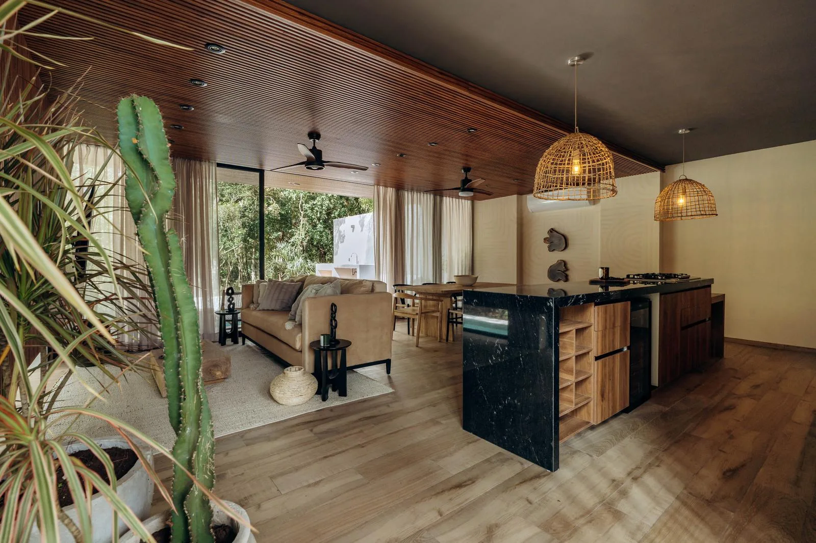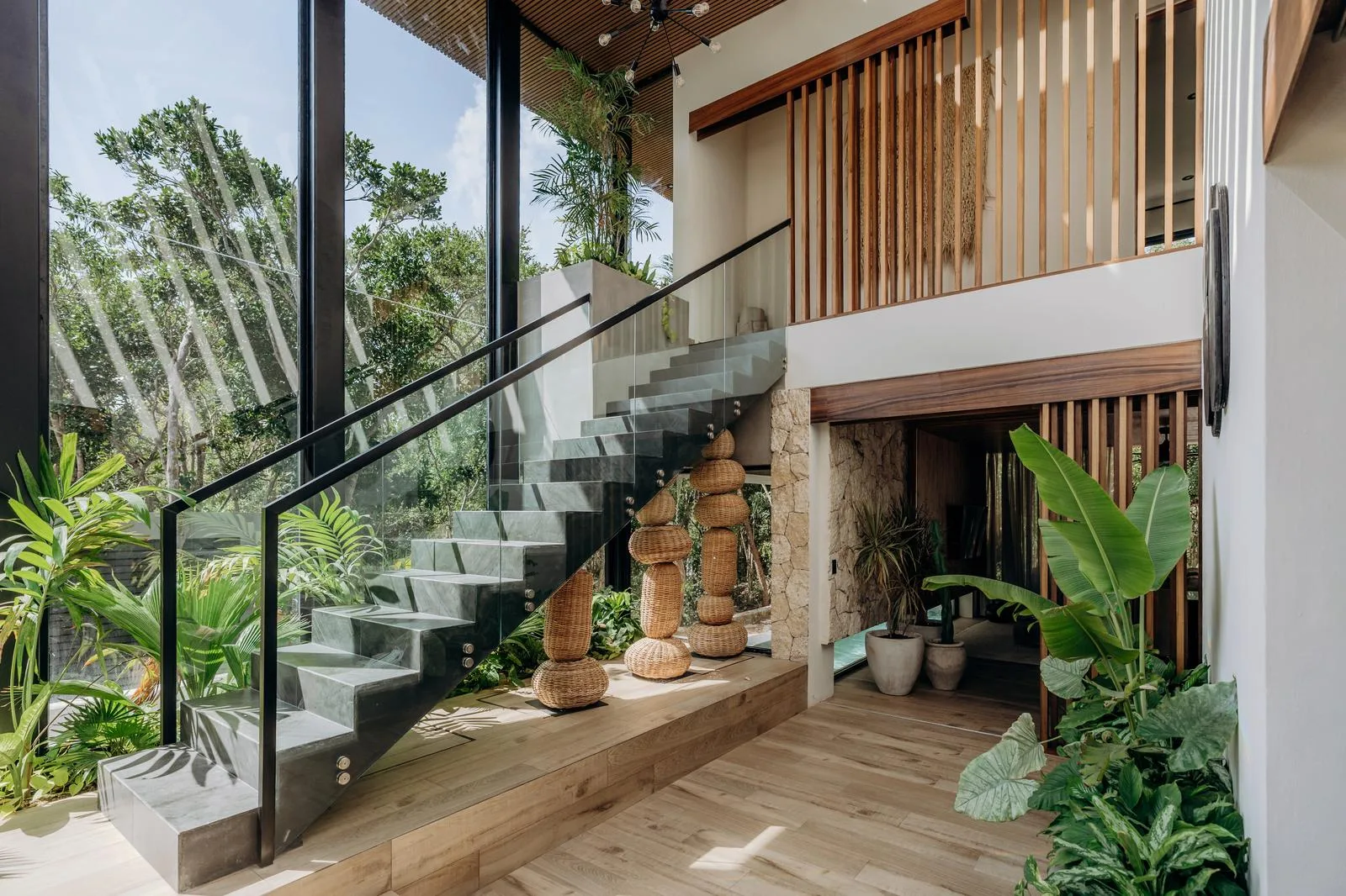 The residence is situated in a peaceful, ecologically conscious gated community near the beach in Tulum. The area is recognized for sustainable development and a harmonious connection with nature. The neighborhood combines modern amenities with environmentally friendly design, offering a tranquil environment surrounded by lush greenery. It is close to the vibrant culture, beaches, and attractions of Tulum.