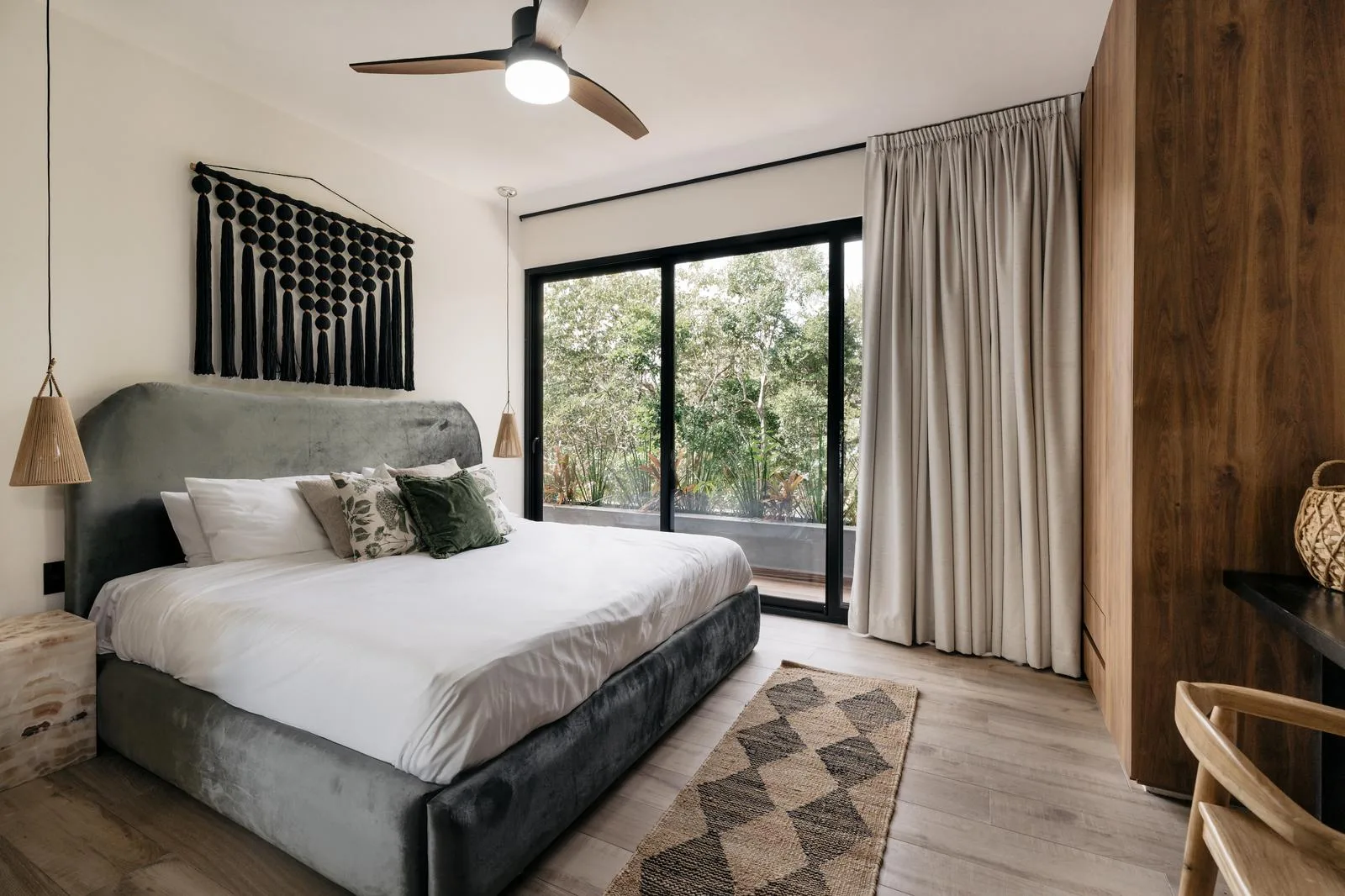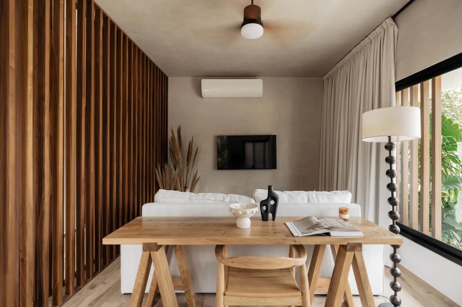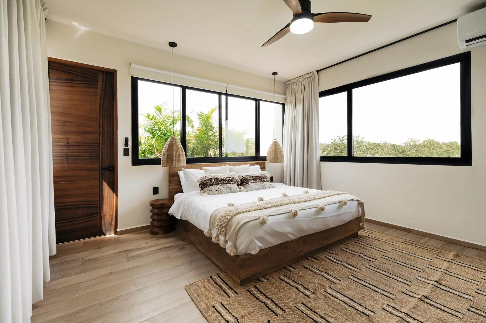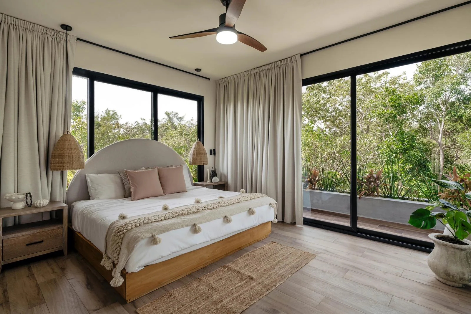 The residence is situated in a peaceful, ecologically conscious gated community near the beach in Tulum. The area is recognized for sustainable development and a harmonious connection with nature. The neighborhood combines modern amenities with environmentally friendly design, offering a tranquil environment surrounded by lush greenery. It is close to the vibrant culture, beaches, and attractions of Tulum.