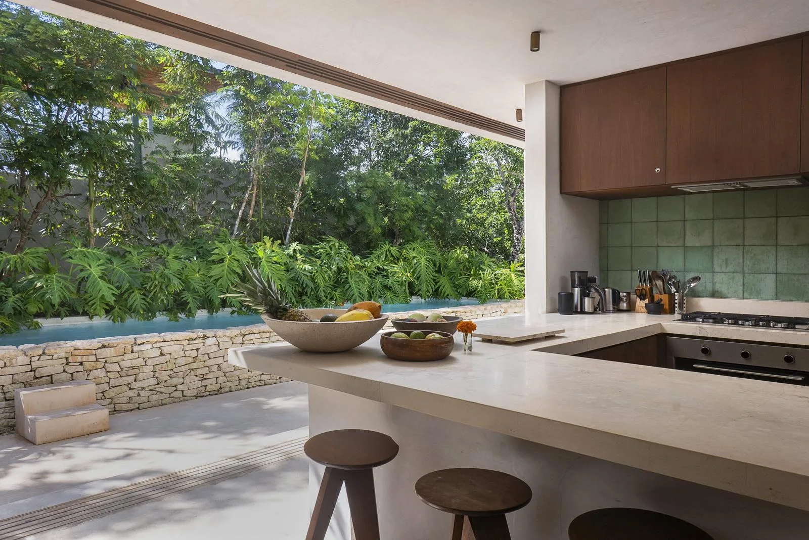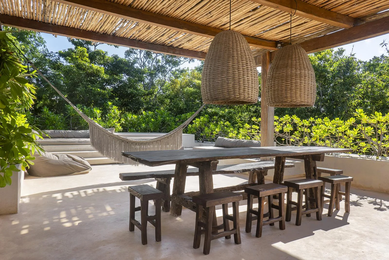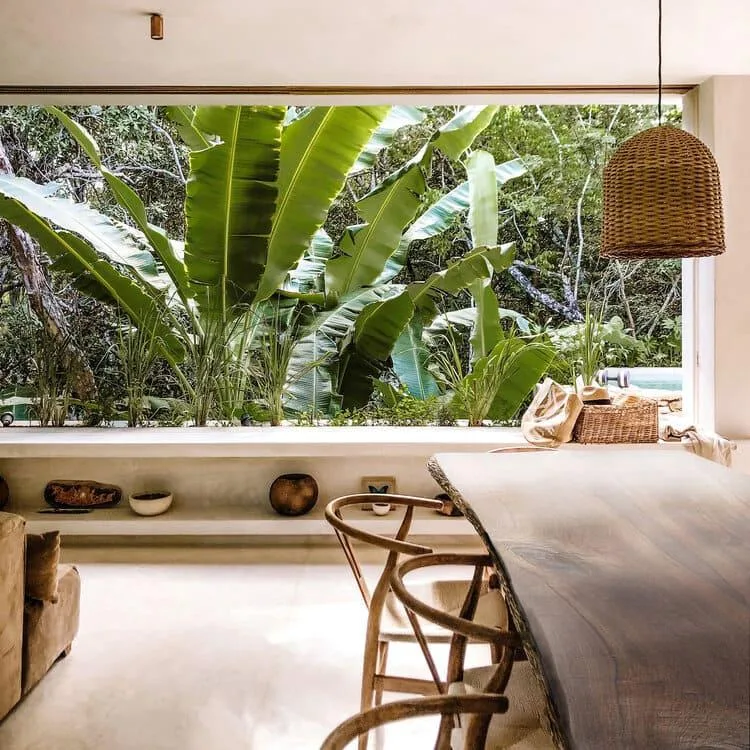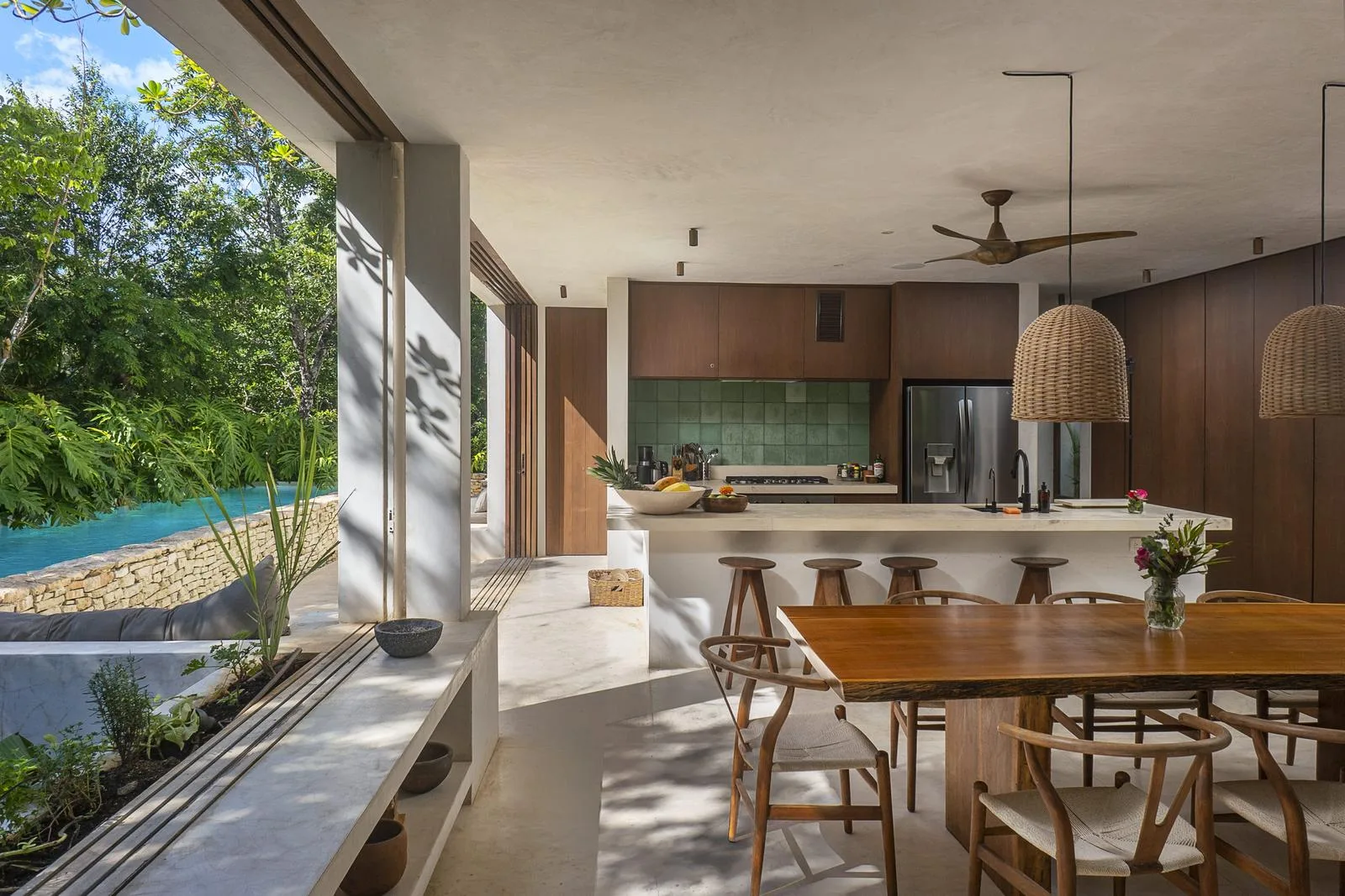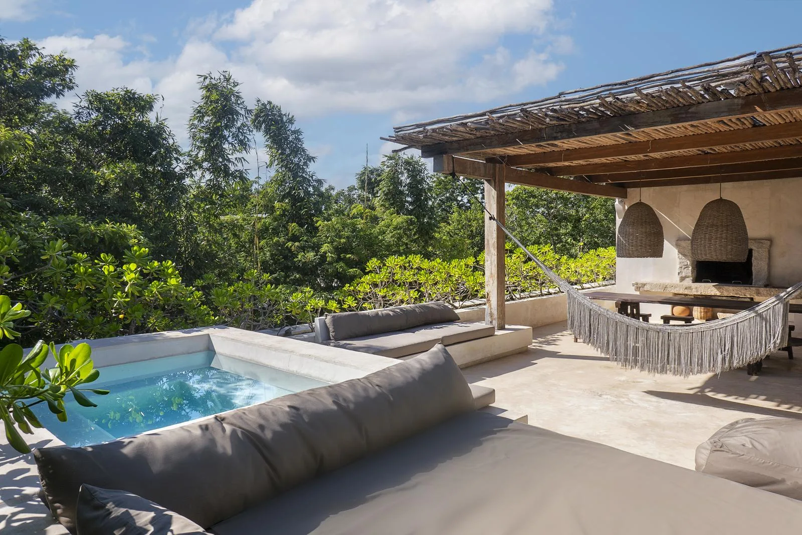 This villa combines contemporary architectural design with natural elements from the region. It is situated within the gated community of Aldea Zama in Tulum.