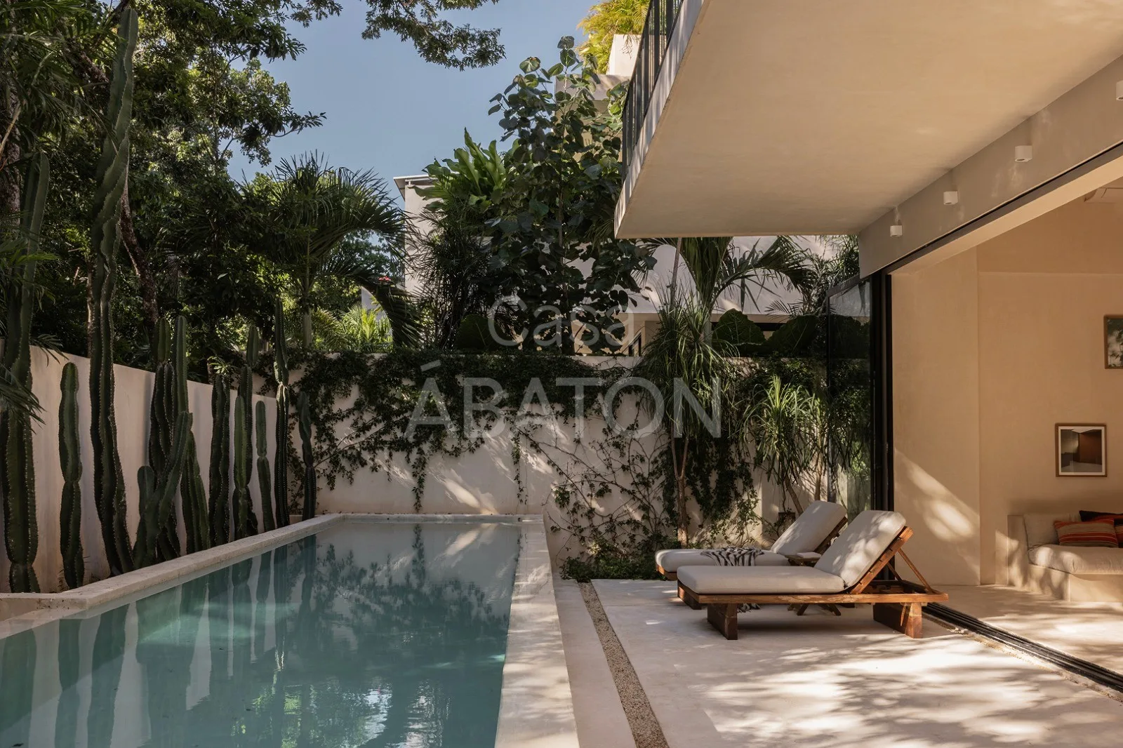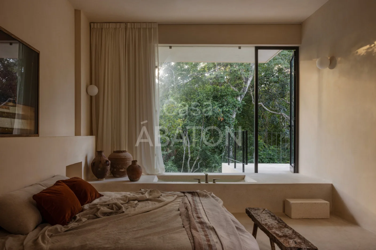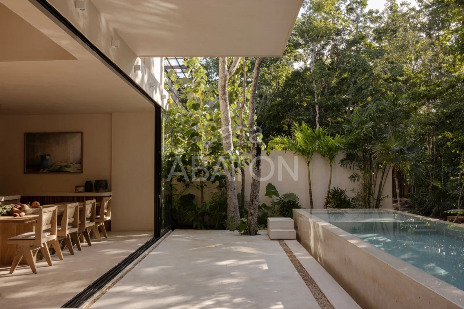 The finishes are natural and minimalist, resulting in a refined, functional, and timeless atmosphere. The property features two swimming pools. One is on the ground level, integrated into the main living areas, and the other is on the rooftop terrace, designed for year-round enjoyment of the Tulum climate. The house is delivered fully furnished and ready for occupancy.
