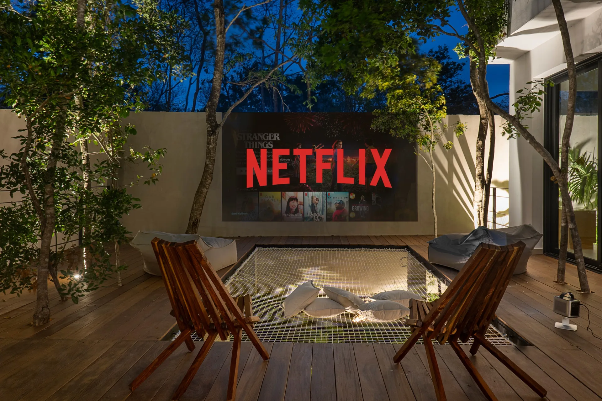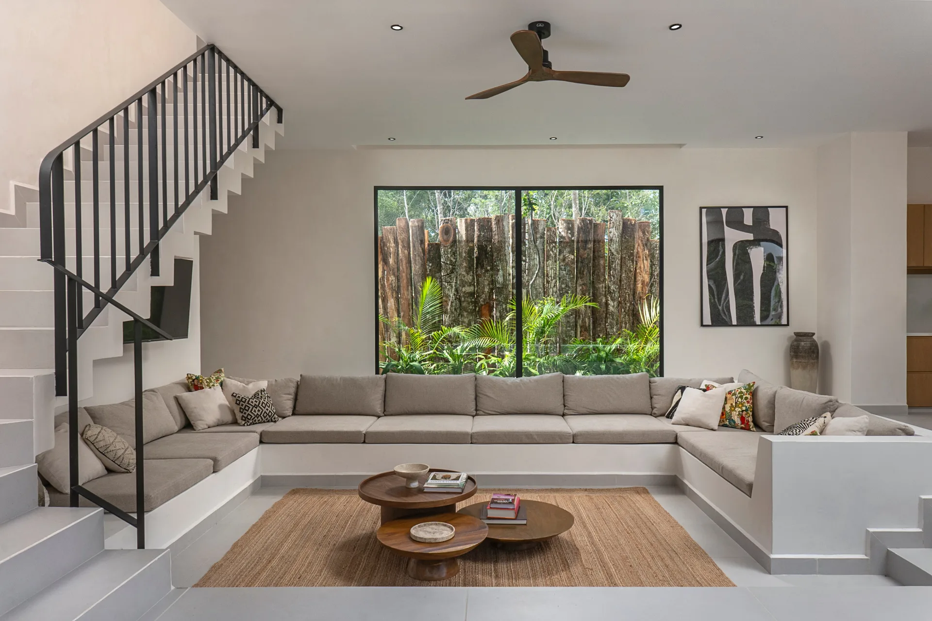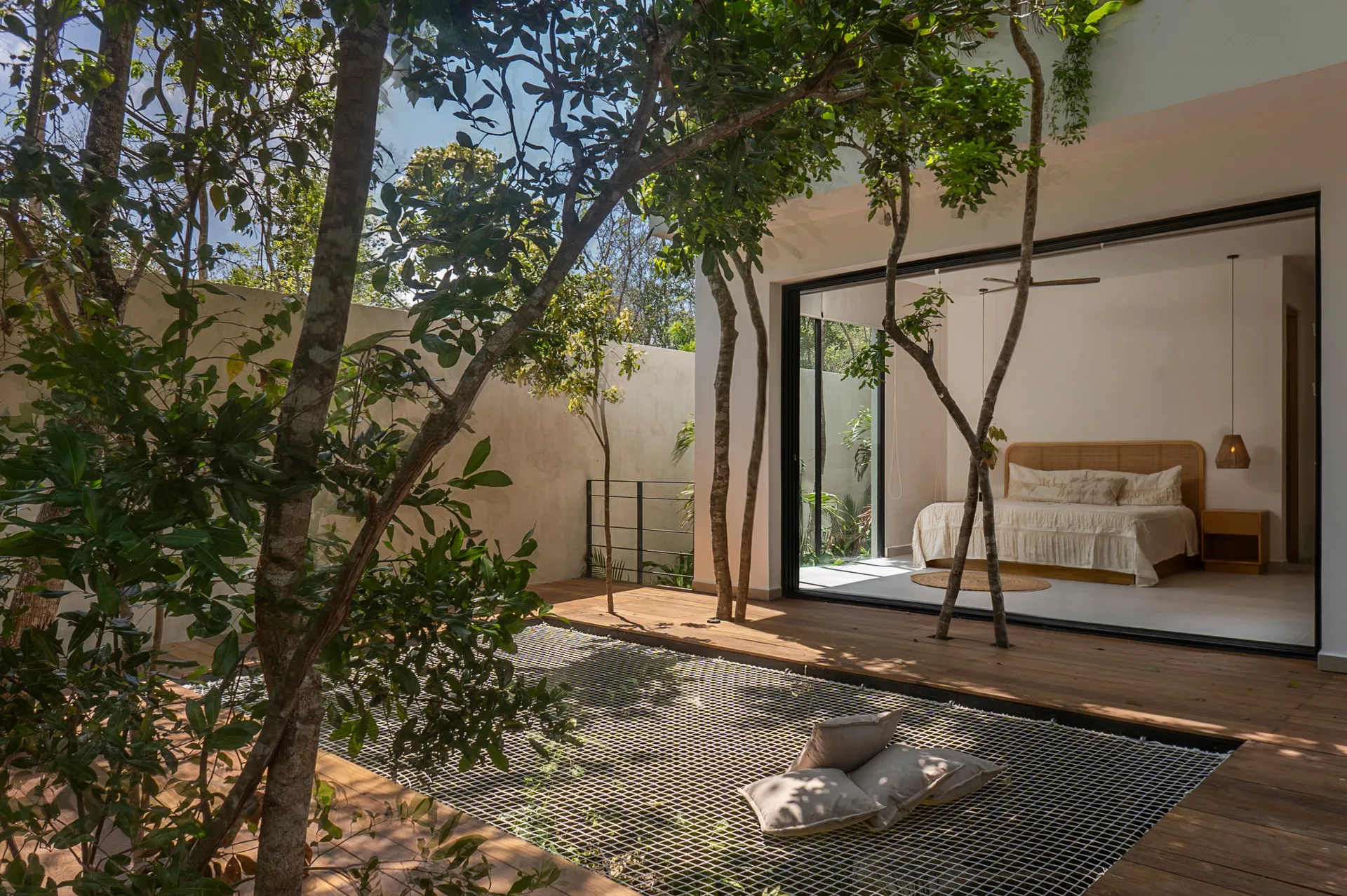 The villa is masterfully built on stilts. The ground floor features a signature sunken living room that opens through expansive pocket doors to a floating terrace. This terrace includes an emerald-toned pool, a professional BBQ area, and a multi-use lounging net.