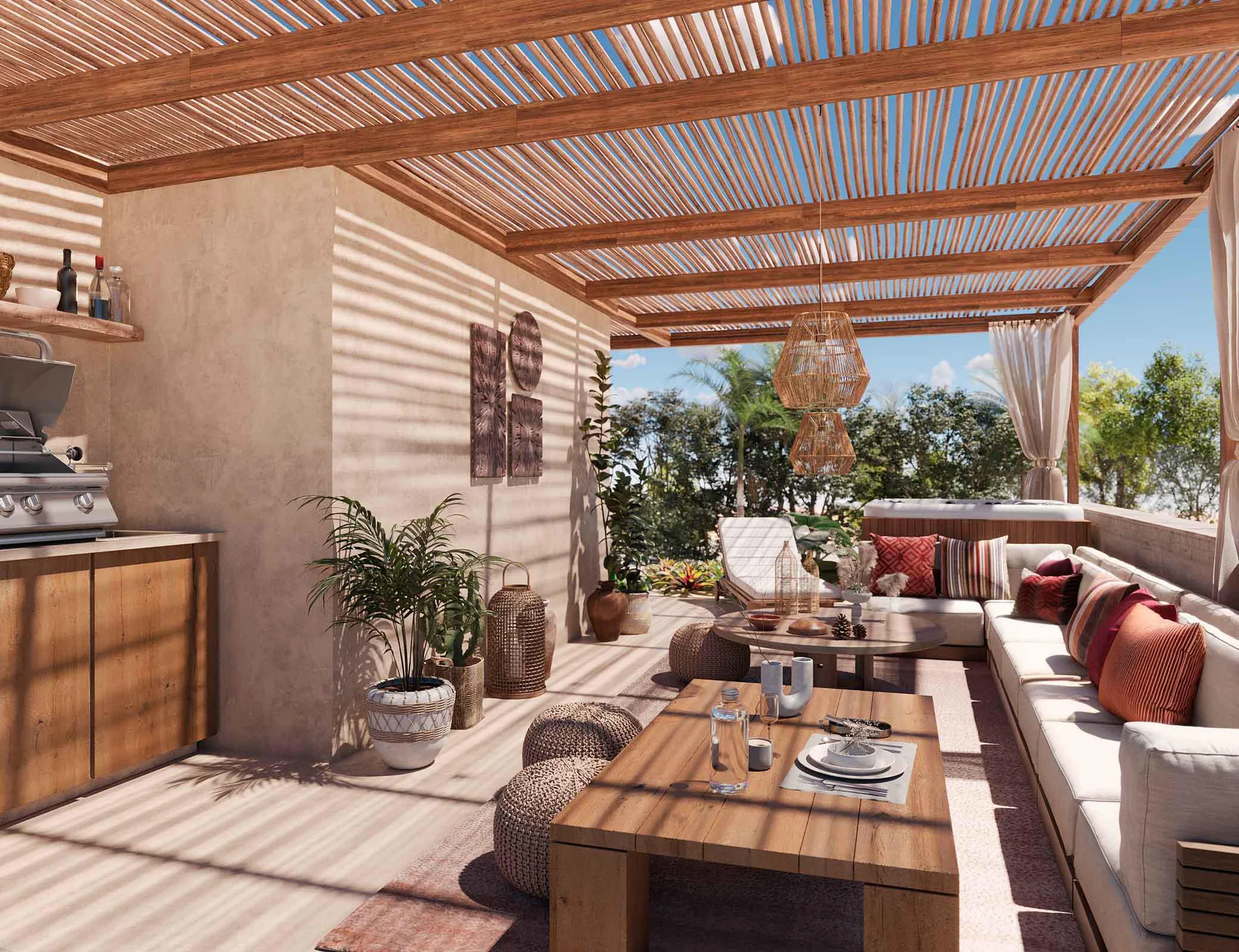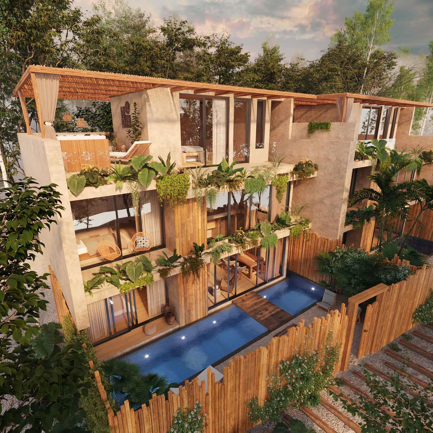 The architecture evokes historic elegance and utilizes natural materials that celebrate the local environment. Each residence is a harmonious retreat where refined living meets the serenity of the jungle.