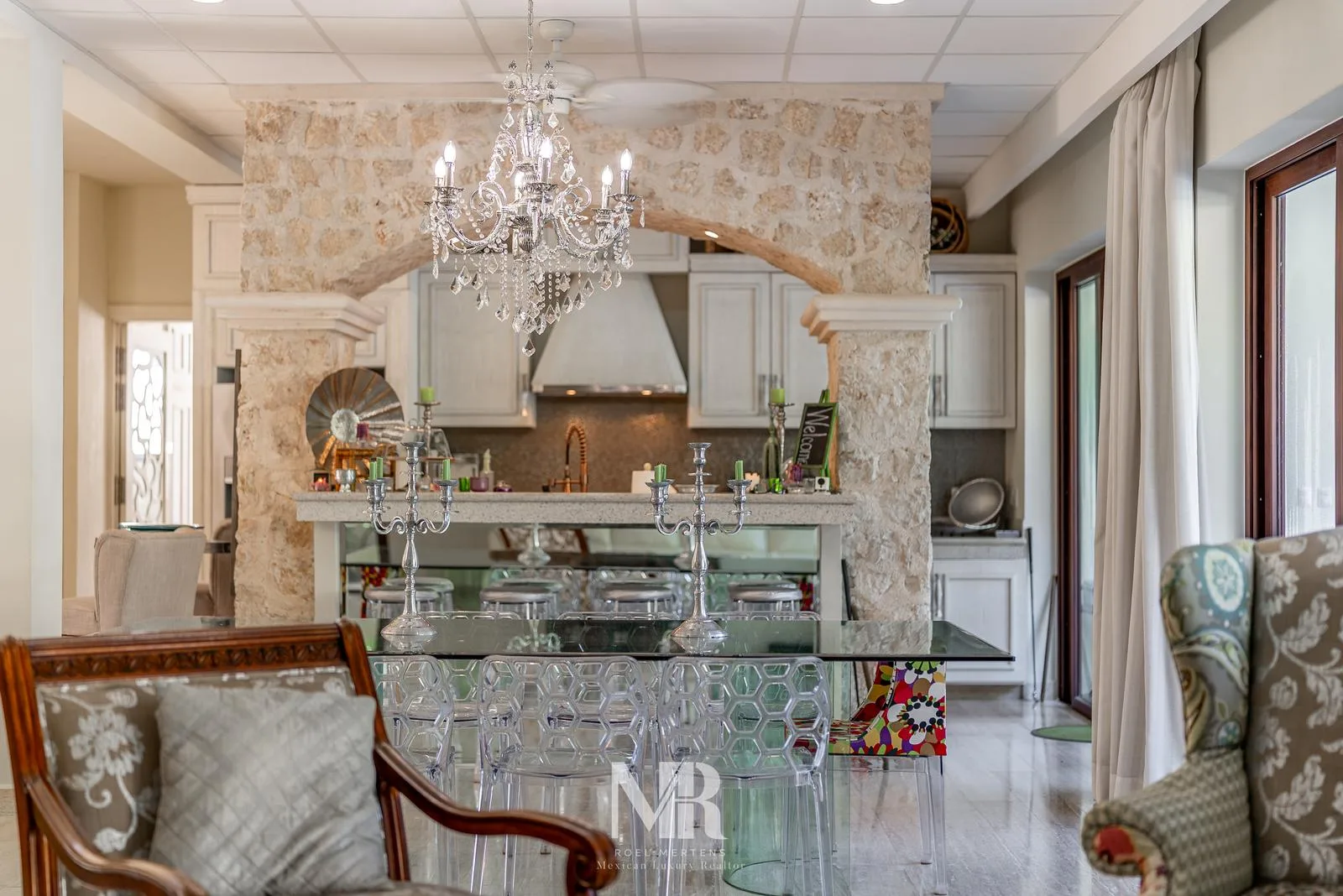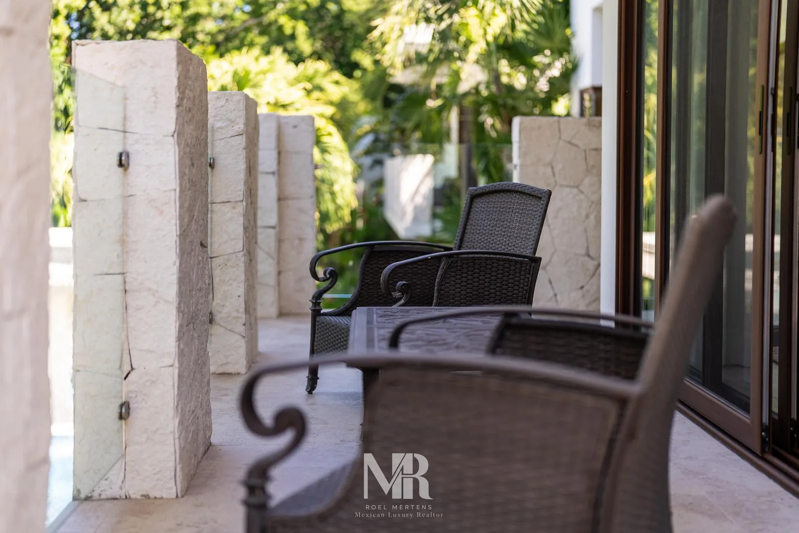 The villa consists of a main house and a guest house, constructed on a double lot at the end of a cul-de-sac with a fairway of the PGA golf course within Tulum Country Club as a backdrop. Surrounded by lush vegetation, the property offers tropical privacy with a backyard and pool. Its architectural style is contemporary, while the interior design features classic furnishings, lamps, and decor. Both structures share the same style and excellent finishes, with spacious living areas and ceiling heights of approximately 3. 6 meters.