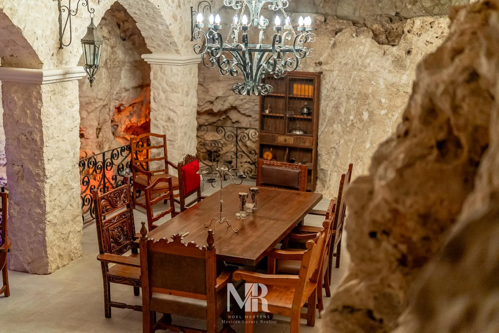 The main house features an open ground floor combining a living area, dining room, and a gourmet kitchen with a small bar, all with views and access to the backyard. This level also includes an enclosed two-car garage, a spacious laundry room, and an en suite bedroom with backyard access. A double-width staircase leads from the main living room to the first floor, and an antique door opens to a staircase descending to a unique, spacious, and air-conditioned underground cave. This versatile space is designed as a dining room but could serve as a wine cellar, spa, or game room. The first floor contains a spacious open hallway with a reading nook, a linen closet, a secondary en suite bedroom, and a master bedroom. Another staircase leads from this level to an enormous rooftop.