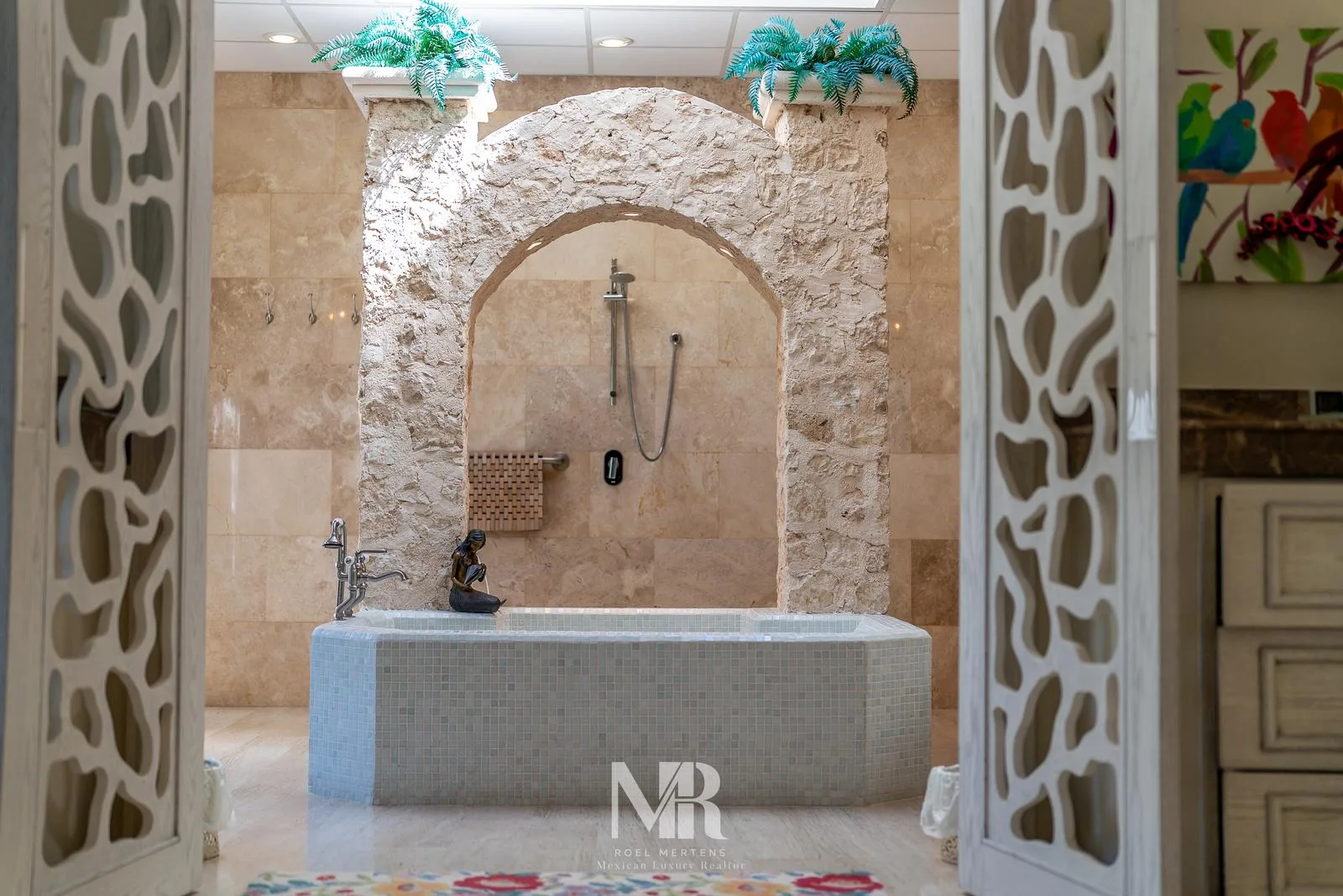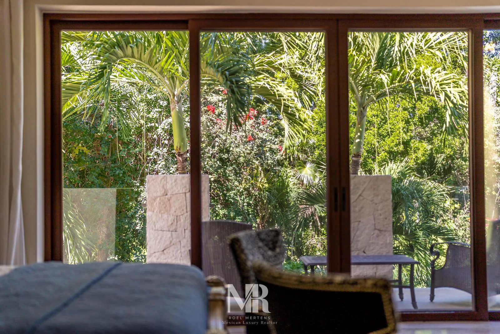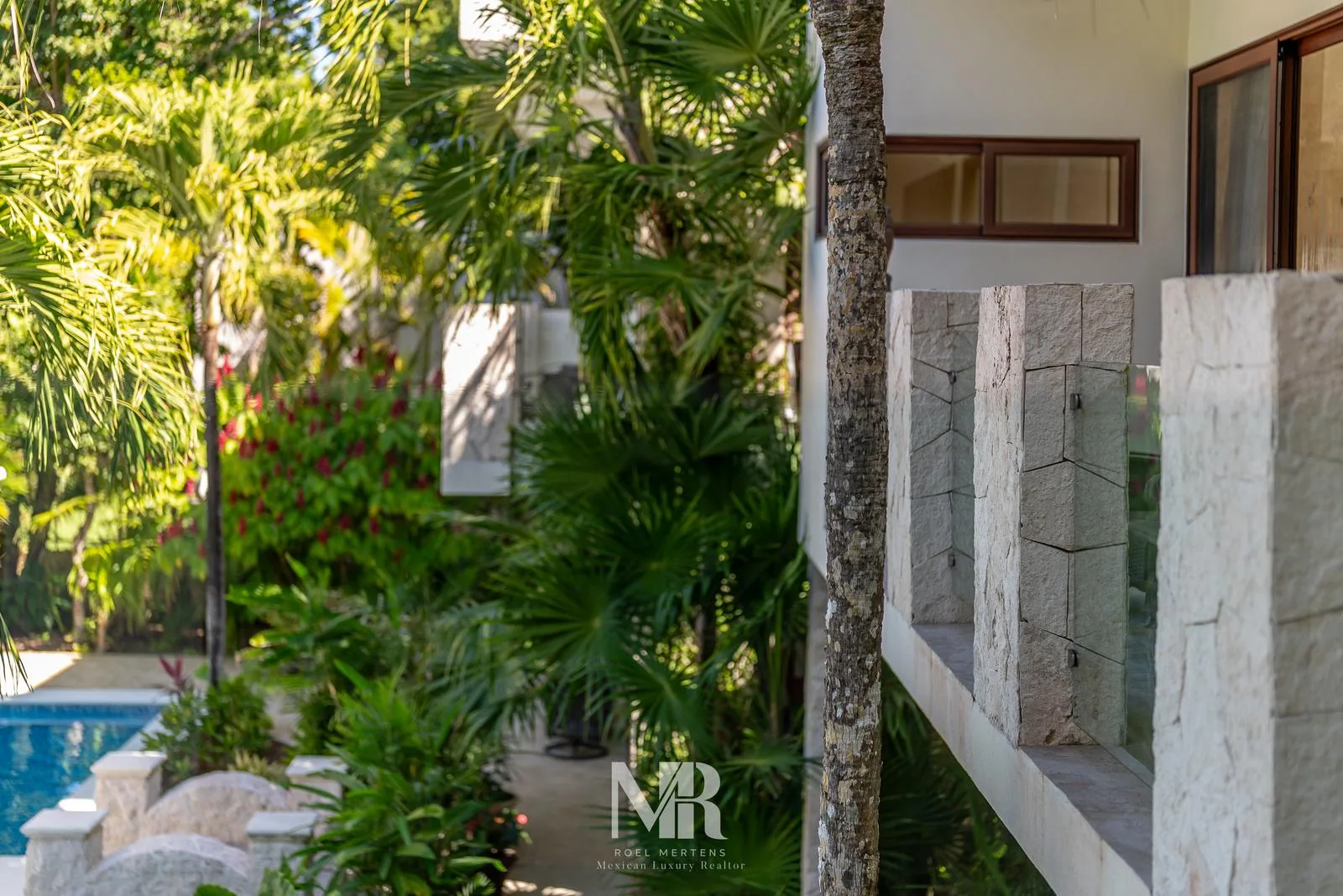 The most striking feature is the backyard, which includes a wide terrace for entertainment surrounded by carefully designed tropical gardens that provide privacy and glimpses of the golf course fairway. The large central pool features a stone arch with a 3-meter waterfall.