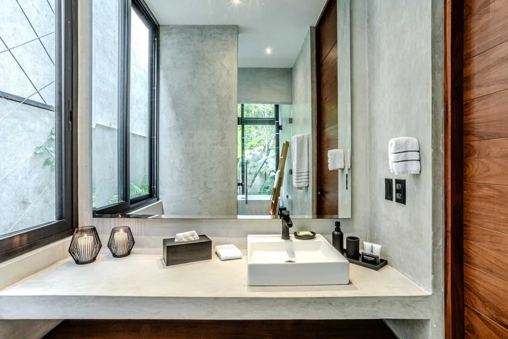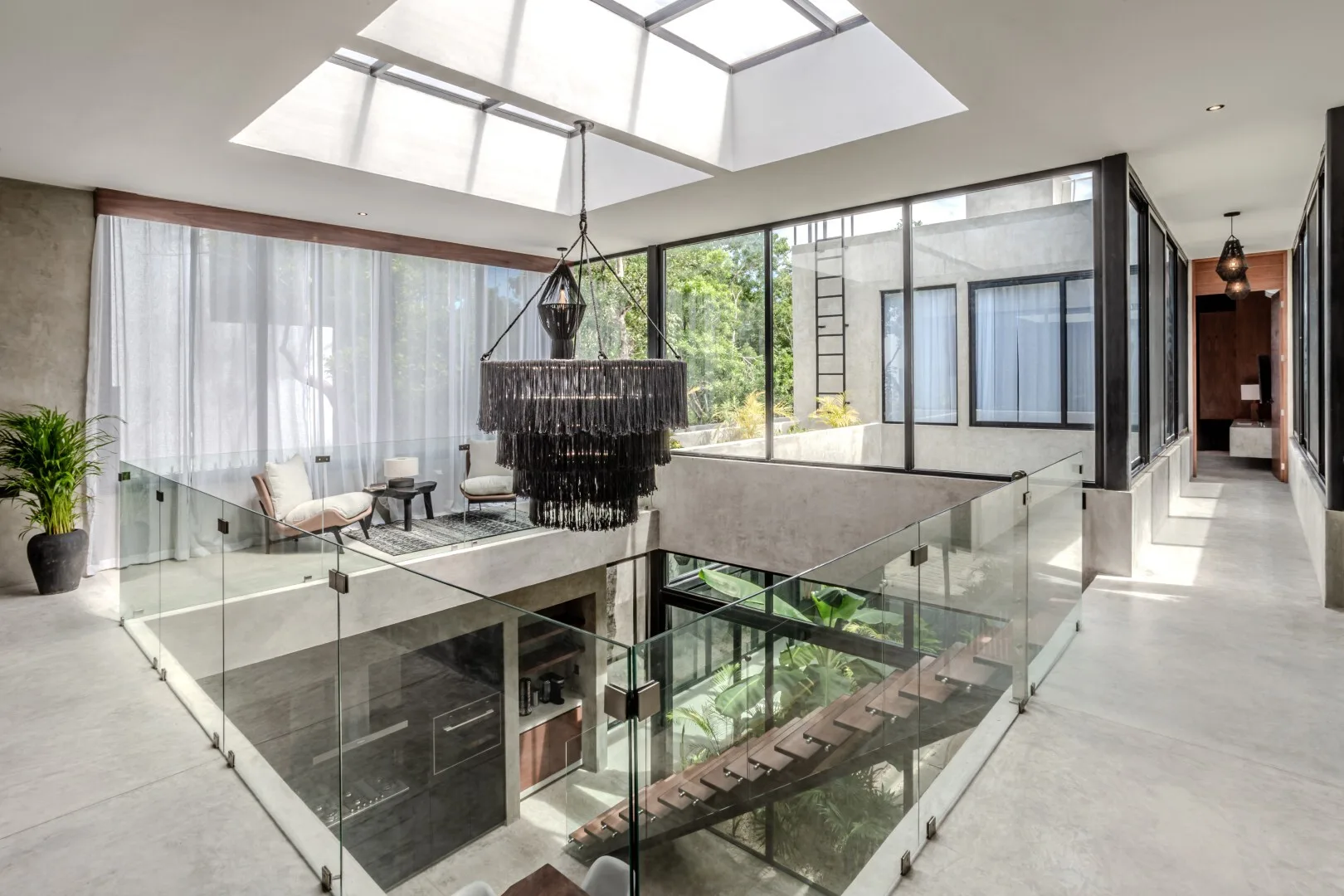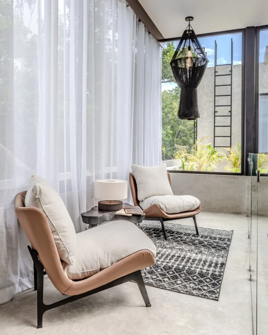 The architecture is thoughtfully crafted with attention to proportion, light, and texture. The home features double-height living spaces, walls of glass, and interior courtyards that create a dialogue between indoors and outdoors. Finishes include polished concrete surfaces, carved local stone, and rich tropical woods within a minimalist aesthetic.