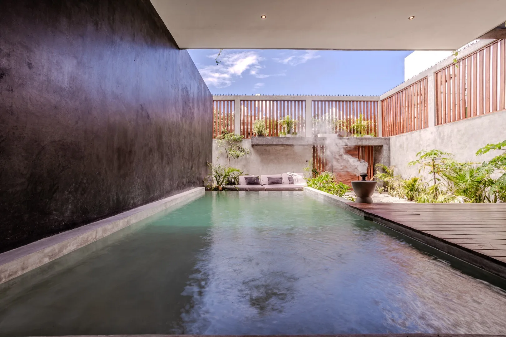 The outdoor environment is crafted for relaxation. A private swimming pool serves as the centerpiece of the tropical garden, framed by sun loungers and shaded seating areas. The home's architecture enhances natural cross-ventilation and maintains visual contact with the surrounding greenery.