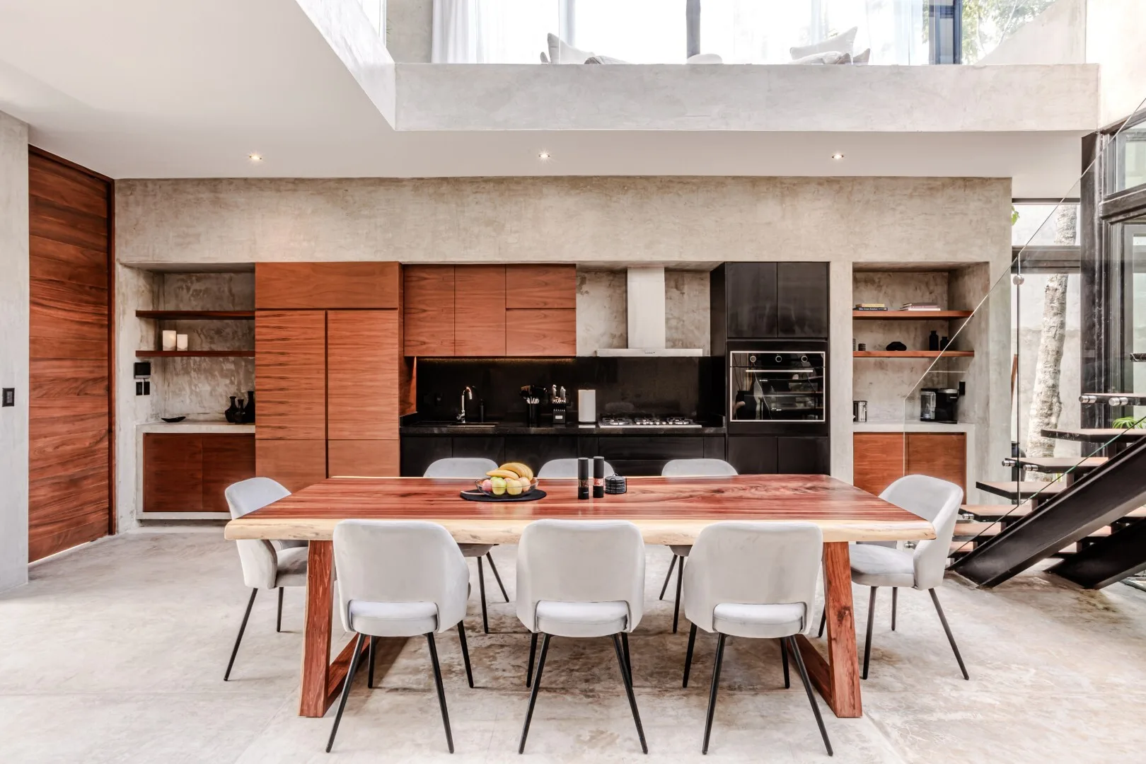 The open-concept living area features dramatic volume and soft natural light. This central space flows into the dining area and an outdoor lounge. The kitchen blends modern design with high-performance appliances.