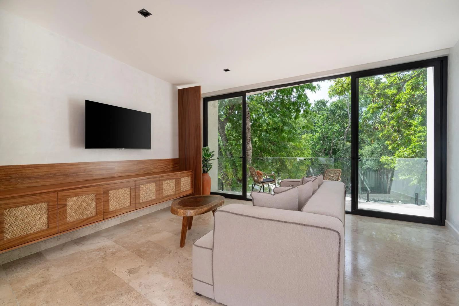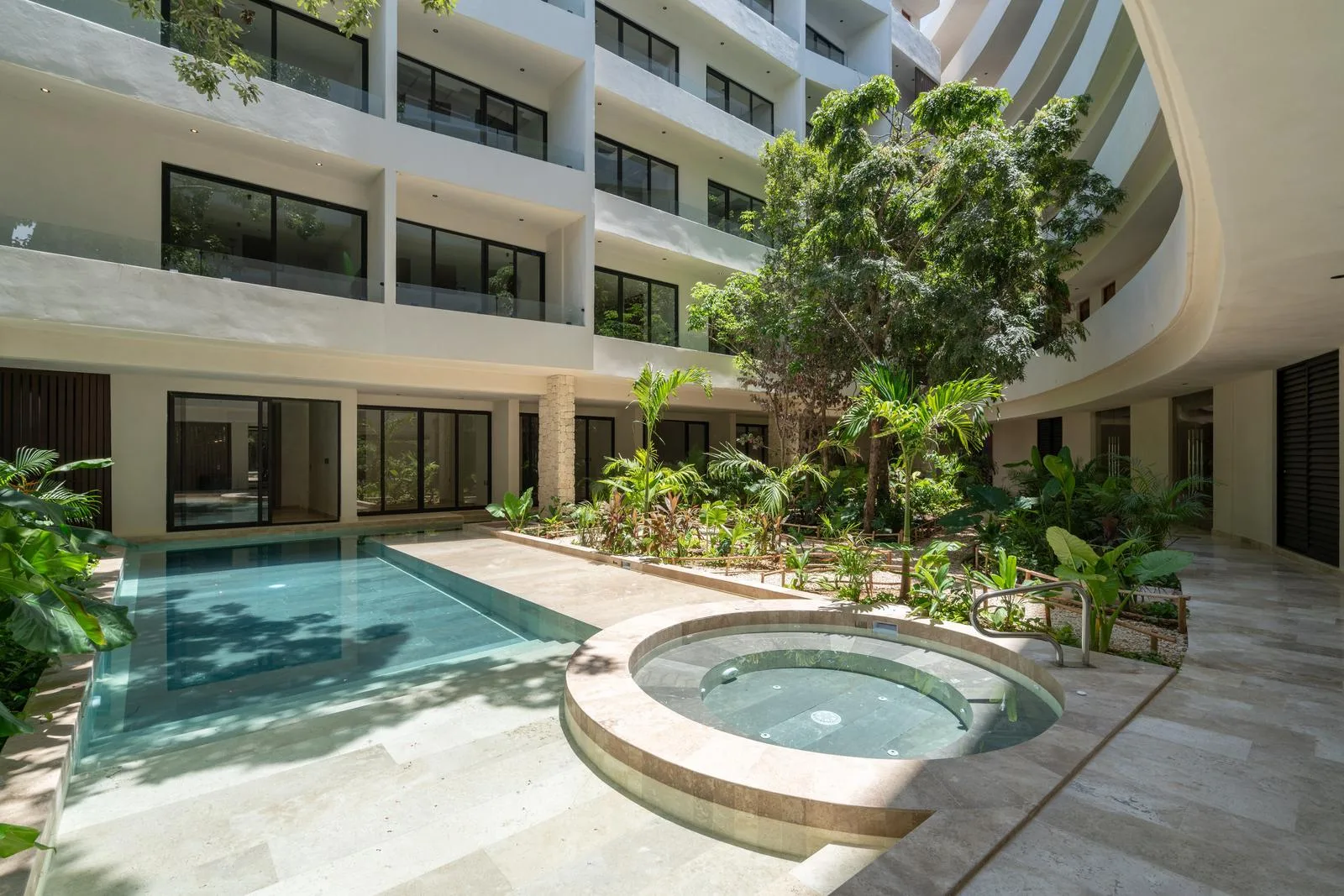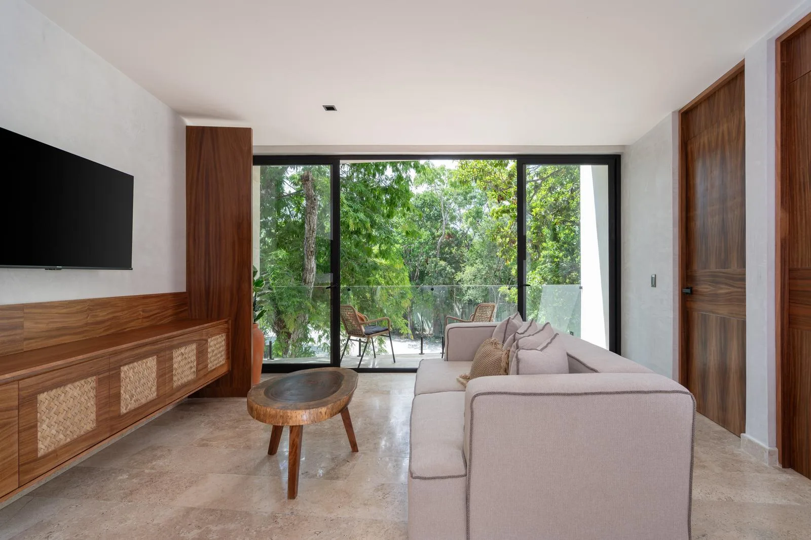 The architecture of this Tulum project features a unique circular facade with fluid lines that integrate harmoniously with the environment. Interior finishes include marble and wood, which create an atmosphere with warm and neutral tones. Spacious areas are illuminated by large windows and terraces designed to maximize light and nature.