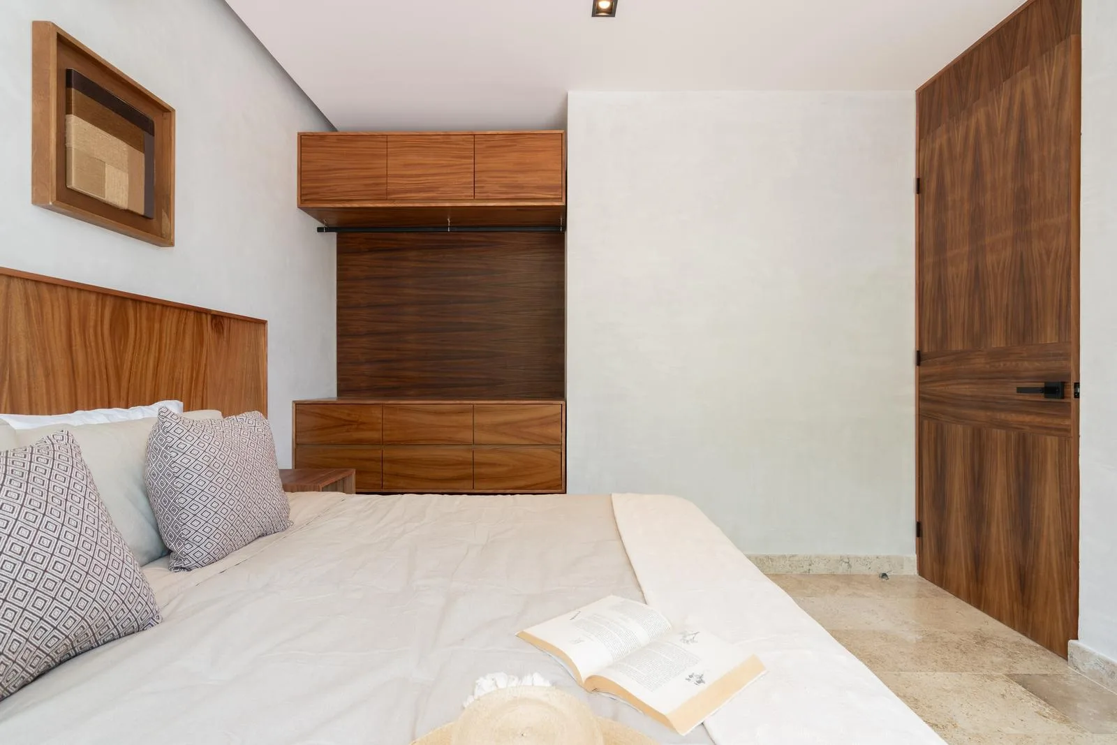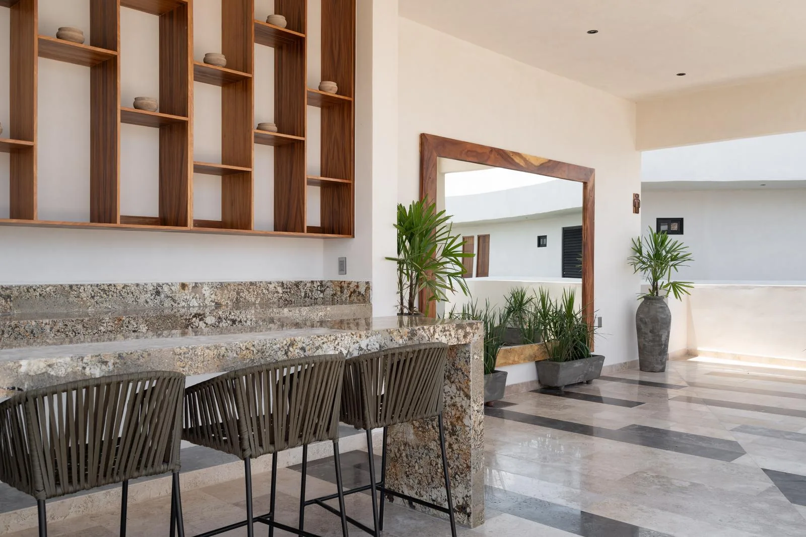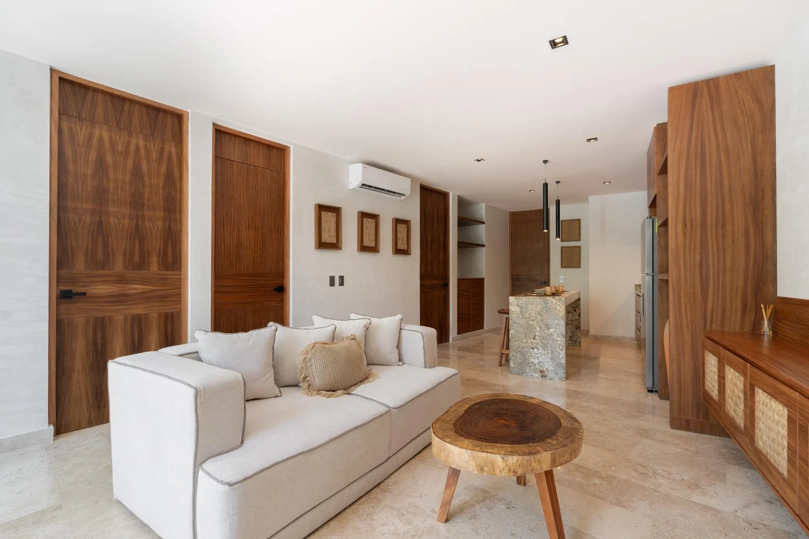The architecture of this Tulum project features a unique circular facade with fluid lines that integrate harmoniously with the environment. Interior finishes include marble and wood, which create an atmosphere with warm and neutral tones. Spacious areas are illuminated by large windows and terraces designed to maximize light and nature.